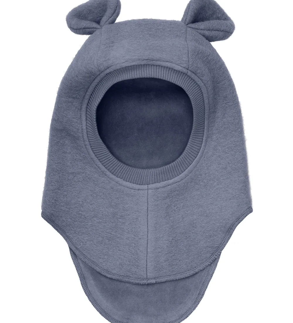 Stilren Huttelihut elefanthue af lunt uldfleece i blå. Huttelihut elefanthuen består af to lag og har en rund hovedform med en fin split-effekt i bunden og små ører på toppen.