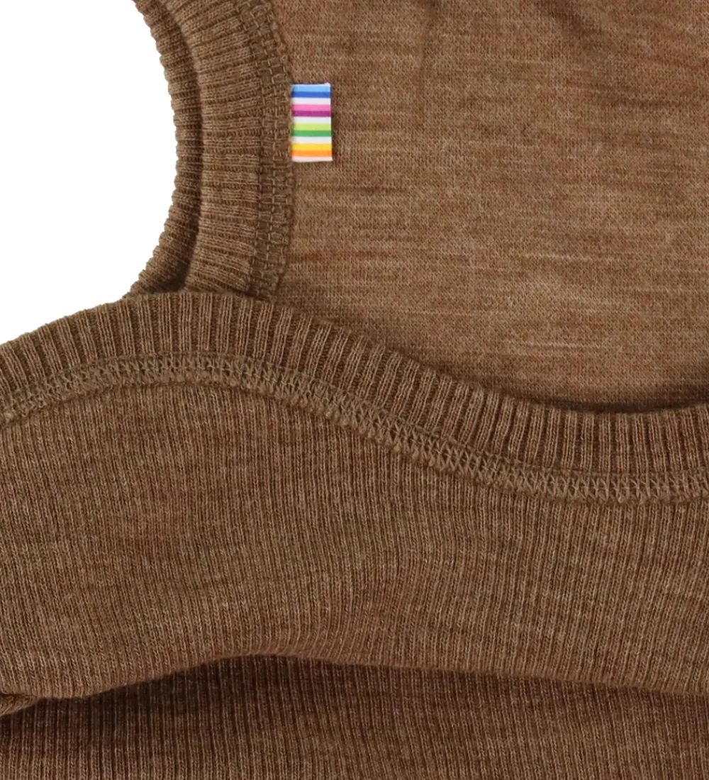 Smarte Joha elefanthue i brun med en ensartet struktur. Joha elefanthuen har to lag og en rund hovedform. Fortil ses knapper, som giver et ekstra stilrent look. Elefanthuen er praktisk designet med en diskret regnbuefarvet etiket.