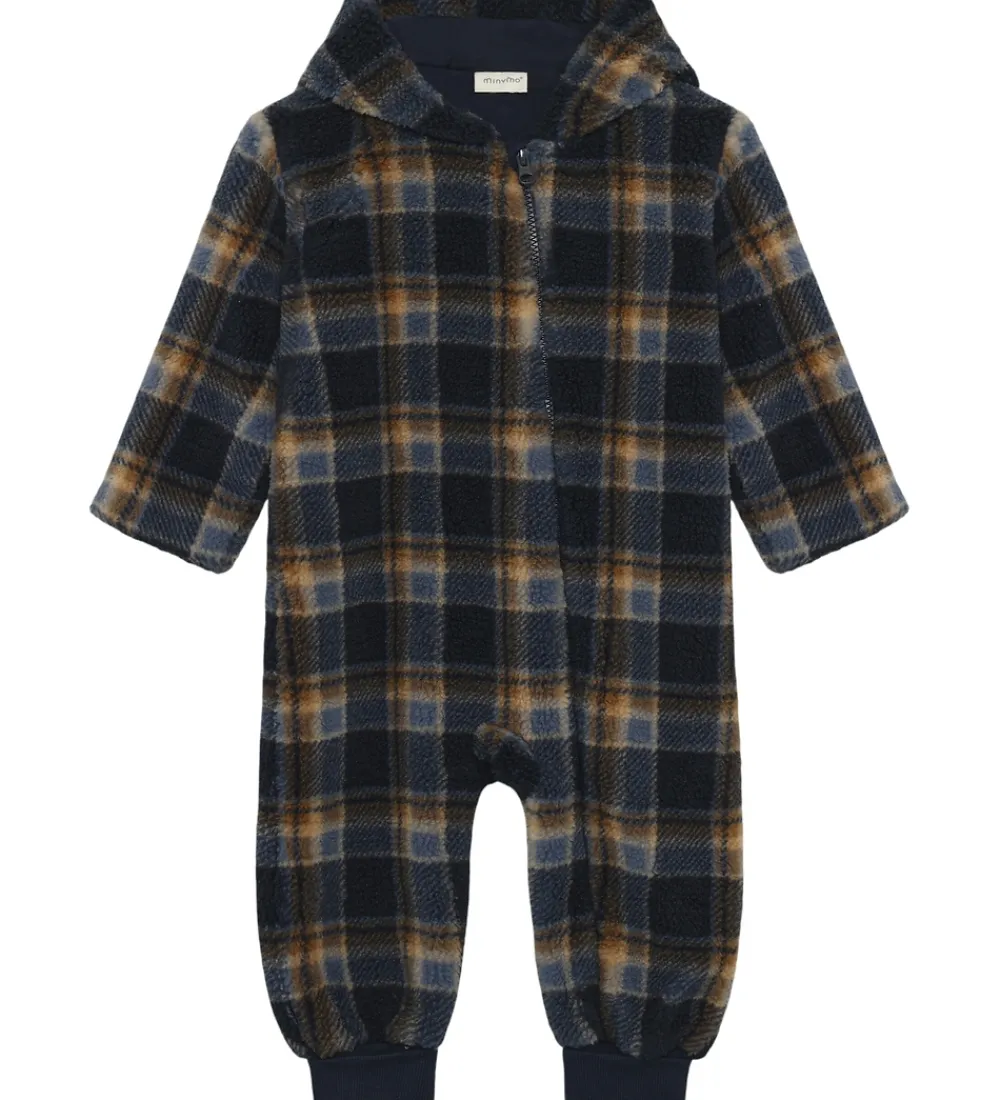 Smart Minymo fleecedragt med et ternet mønster i navy, beige og støvet blå.
