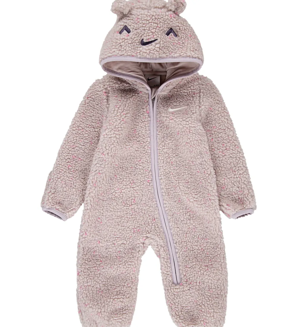 Charmerende fleecedragt fra Nike i en blød rosa nuance med bittesmå lyserøde nister, der tilføjer et delikat touch. Nike fleecedragten har en hætte udsmykket med søde øre-detaljer og påsyede grafikker. Den er designet med lange ærmer og ben. Fleecedragten har en praktisk lynlås med hagebeskytter foran, hvilket gør det nemt at få den af og på. På ærmer og ben har dragten ombuk, som holder hænder og fødder varme.