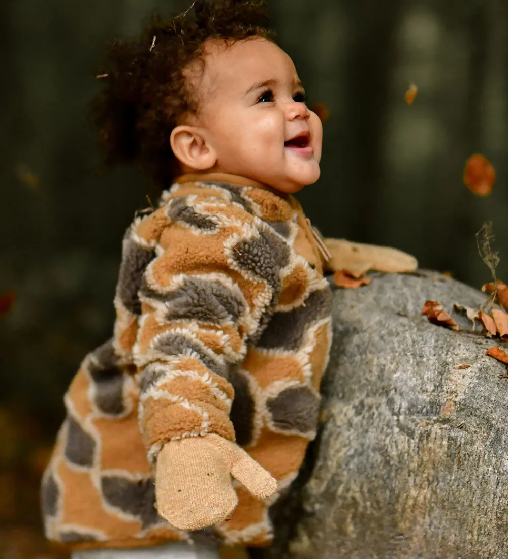 Stilfuld Mikk-Line fleecejakke i brunt fleece med et unikt mønster af teddyfleece i grå og hvid, der minder om camouflagelooket. Mikk-Line fleecejakken er fremstillet i blødt fleece , der giver et indbydende og moderne udtryk.