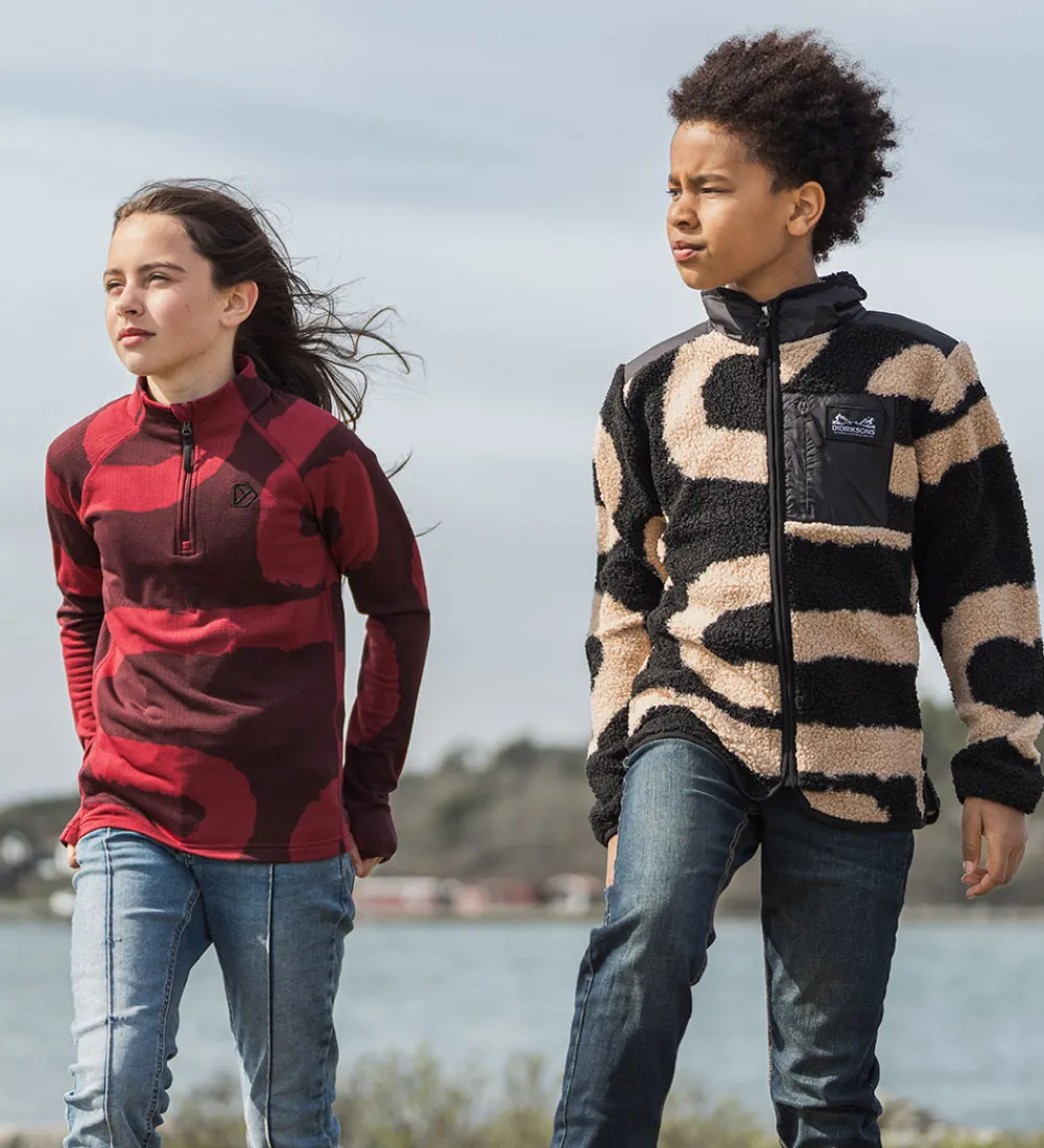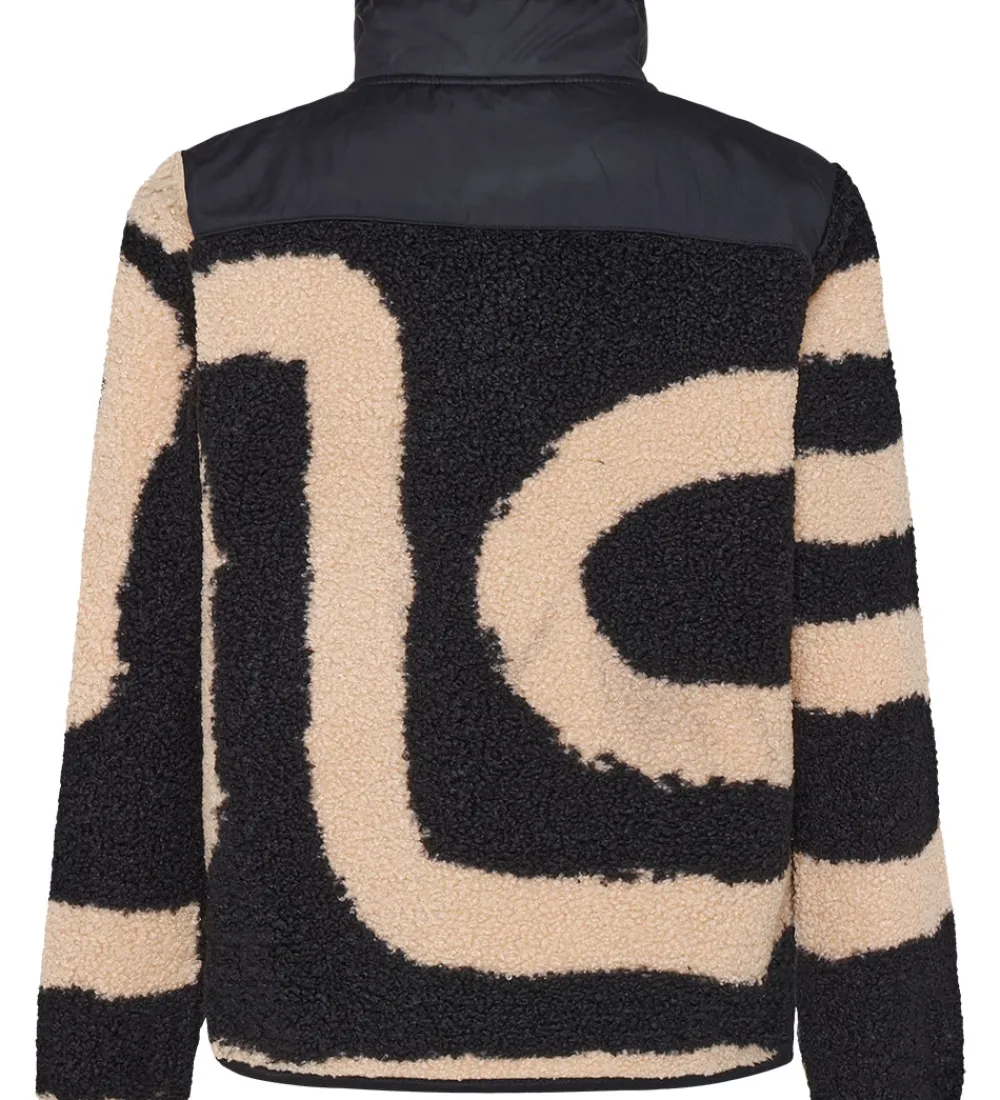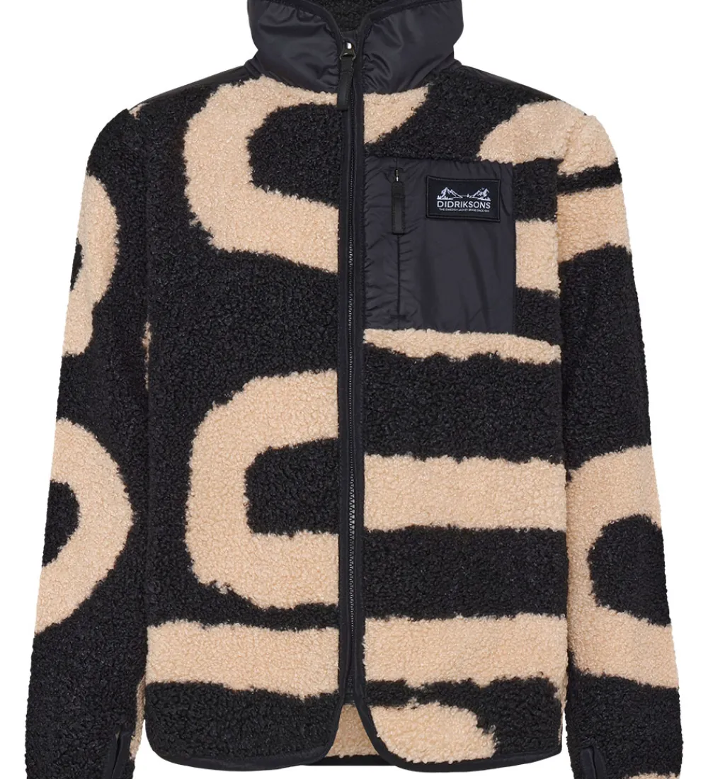 Lækker Didriksons fleecejakke i sort teddyfleece med et beigefarvet mønster af brede, snoede striber. Fleecejakken har en aftagelig hætte, som sidder fast med skjulte trykknapper, og den er lavet i en glatvævet kvalitet. Fleecejakken har smalle, elastiske kanter, og den åbnes med en skjult lynlås med hagebeskytter og indvendig vindstolpe. Ærmerne har et praktisk hul til tommelfingeren, og i venstre side sidder der en brystlomme, som lukkes med en lynlås.