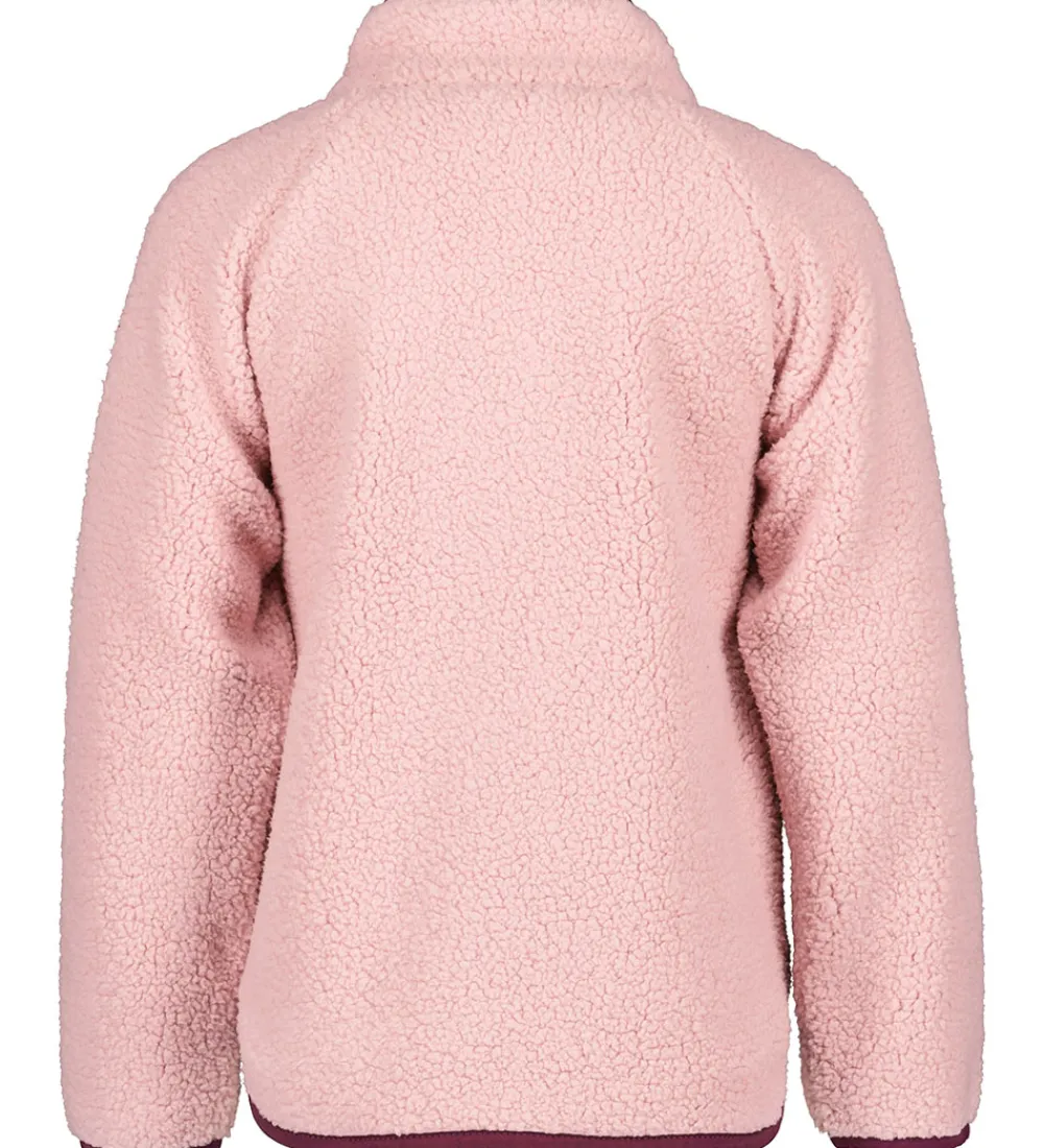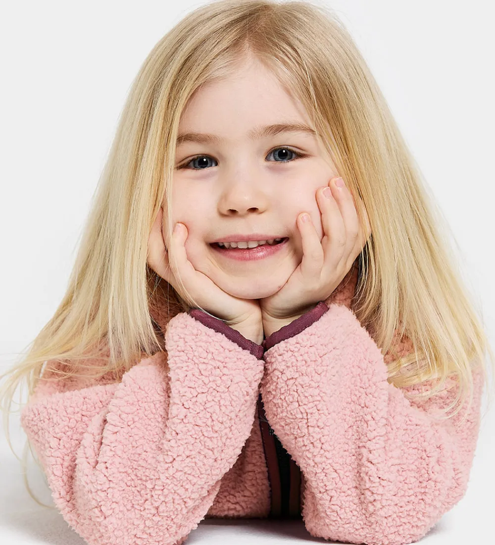 Fin Didriksons fleecejakke i rosa teddyfleece med mørk rosa kanter. På venstre bryst er der en sort logopatch.