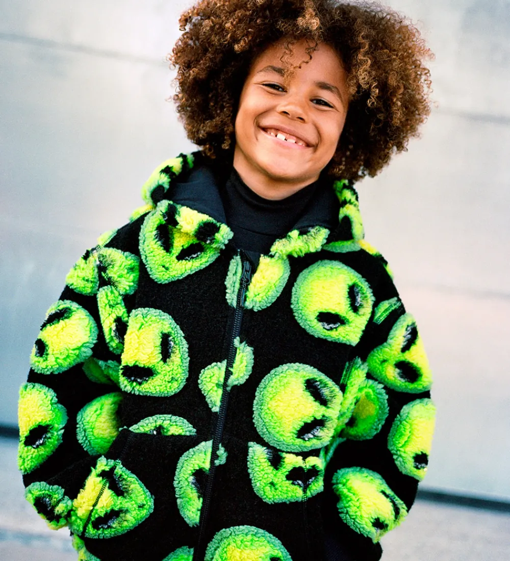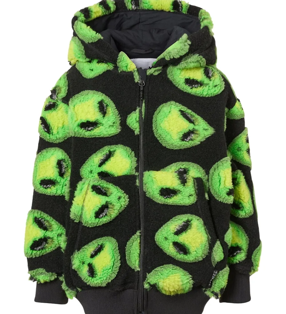 Sjov Molo fleecejakke med et mønster af grønne ansigter på en sort baggrund. Fleecejakken er lavet af teddyfleece.