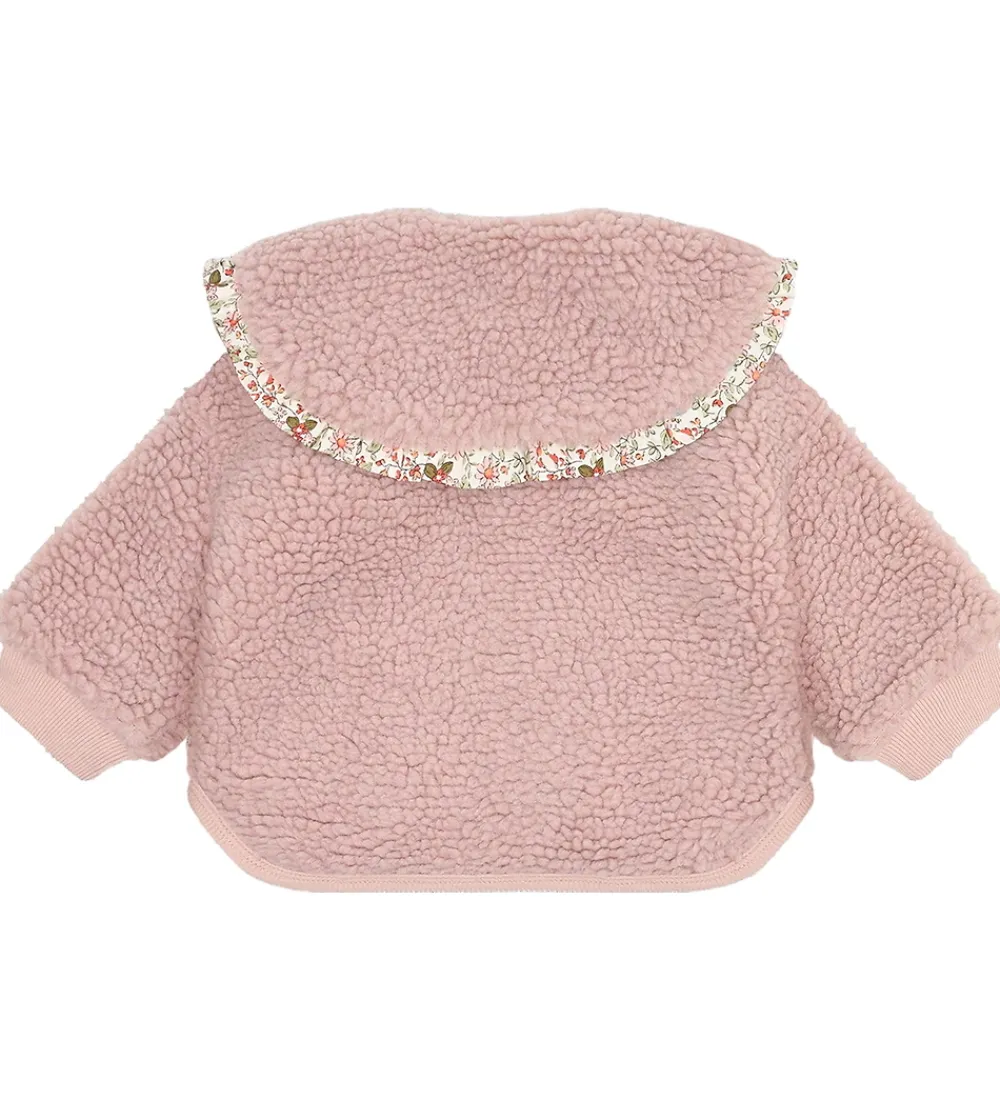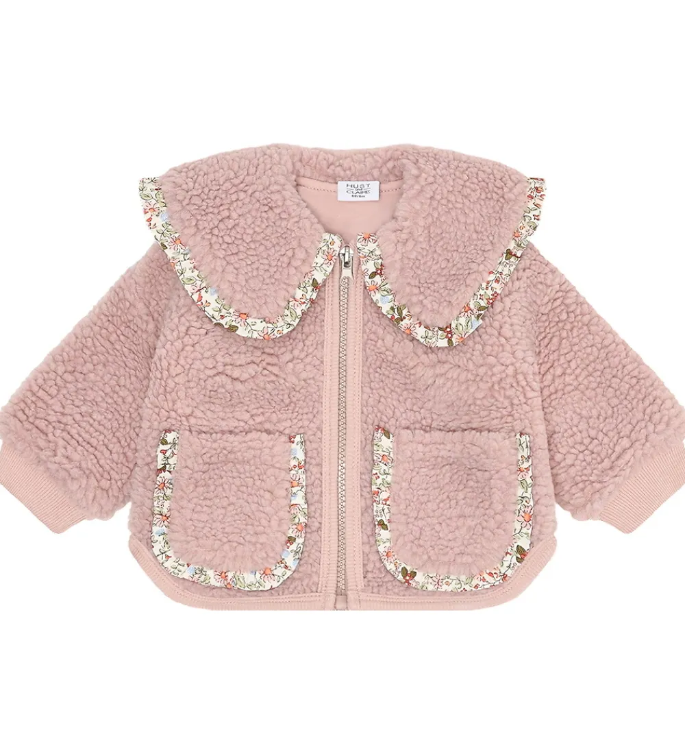 Charmerende Hust and Claire fleecejakke i en blød rosa nuance. Fleecejakken er lavet af teddyfleece, hvilket giver et varmt og indbydende udseende. De blomstrede kanter langs krave og lommer tilføjer et fint og dekorativt touch til fleecejakken.