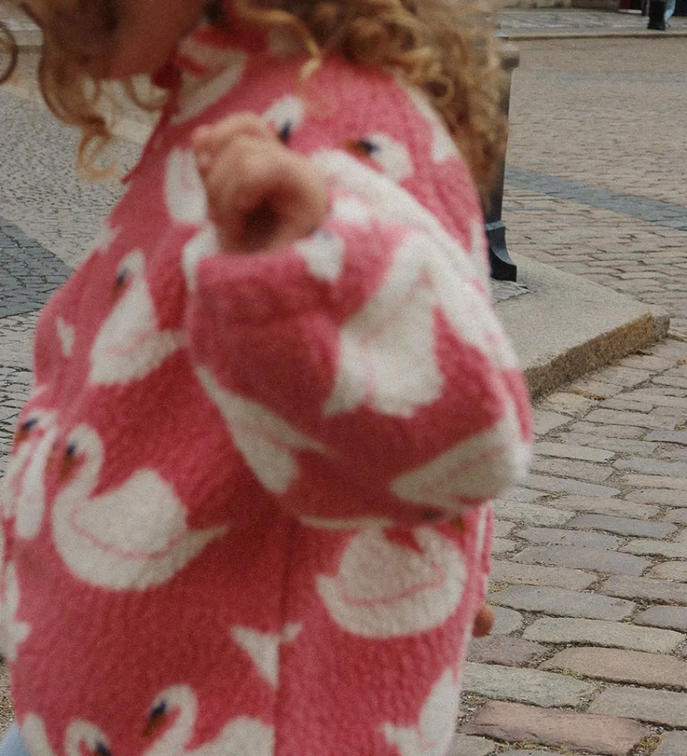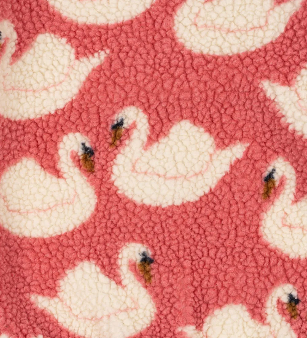 Charmerende Konges Sløjd fleecejakke i pink teddyfleece med et alloverprint af hvide svaner.