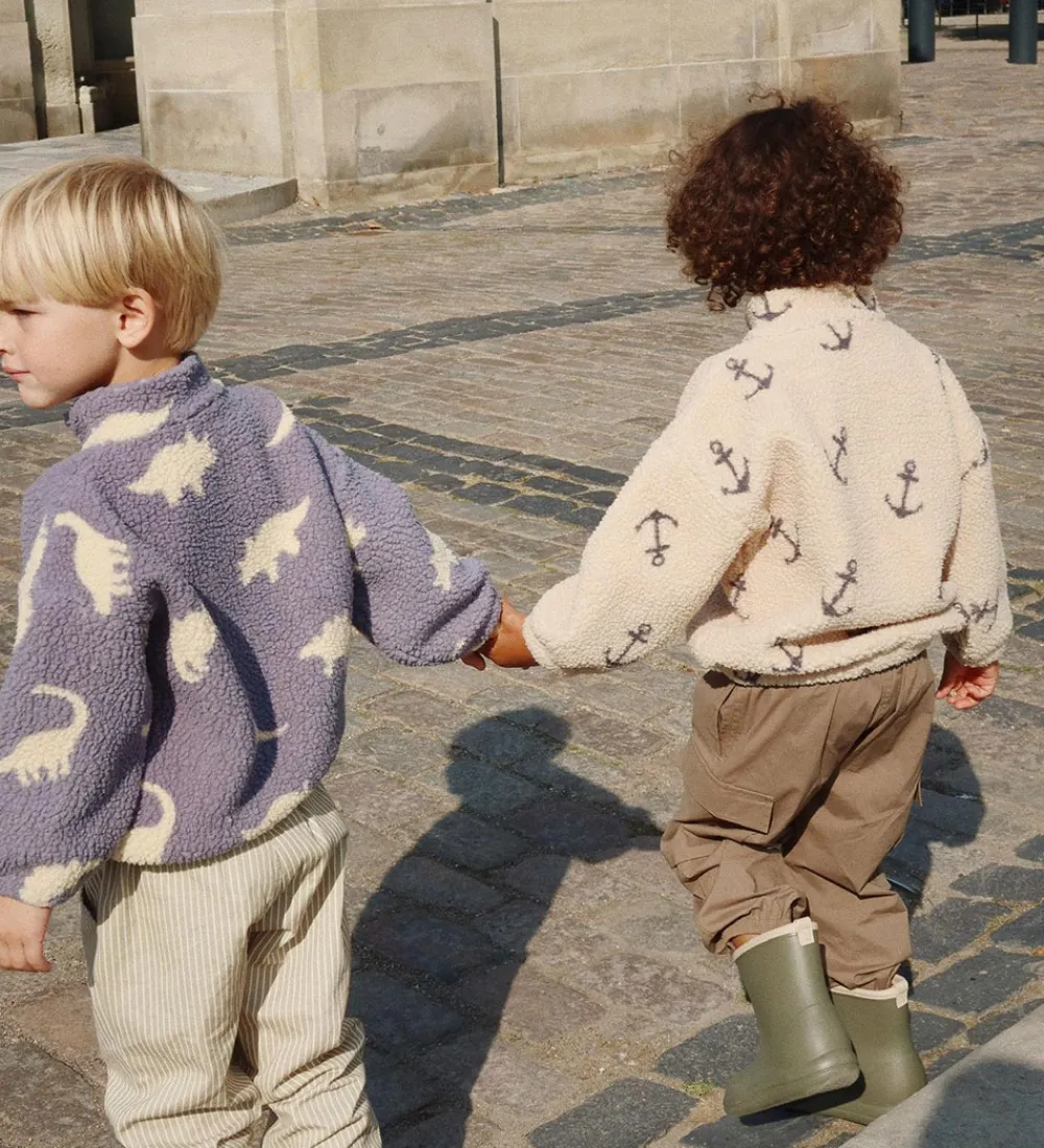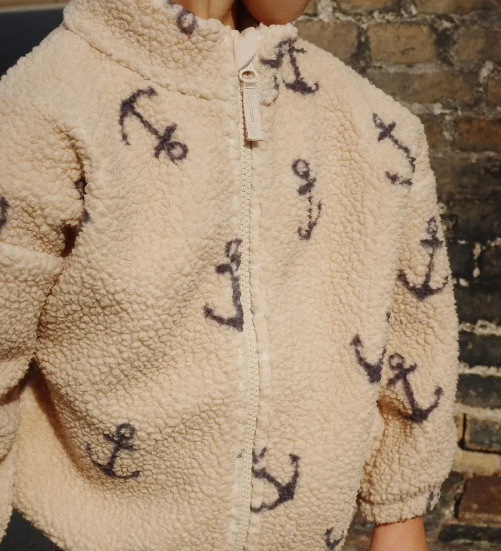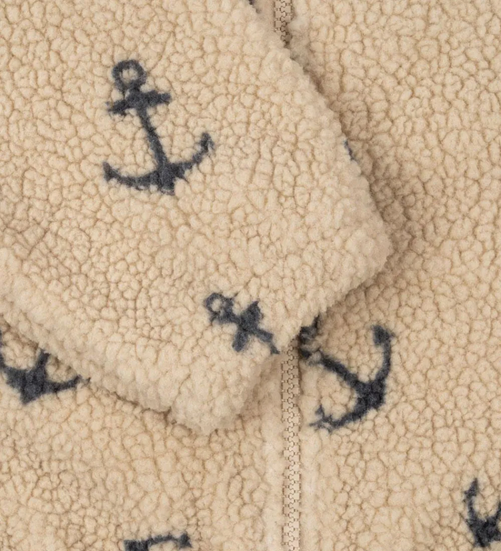 Lækker Konges Sløjd fleecejakke i beige teddyfleece, og med et alloverprint af ankre i mørkeblå.