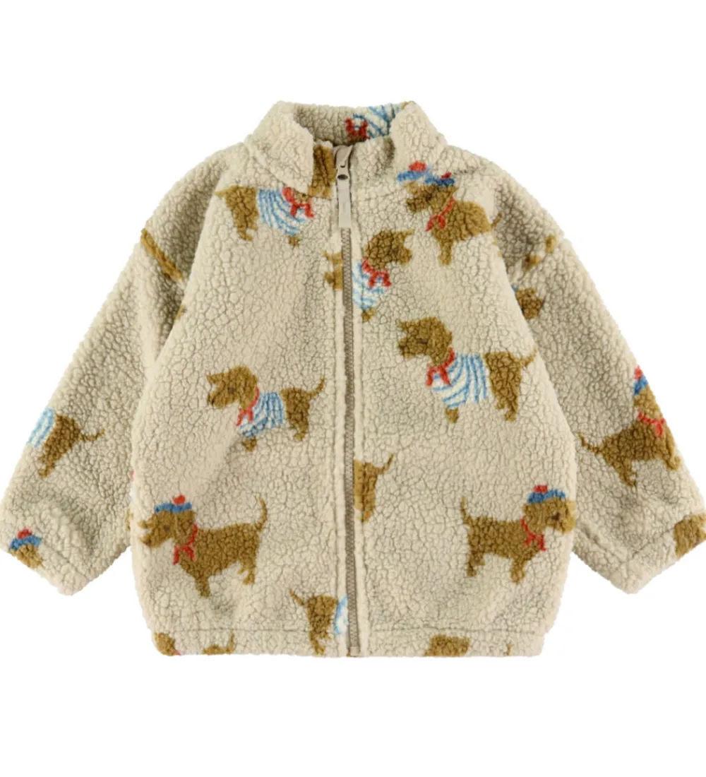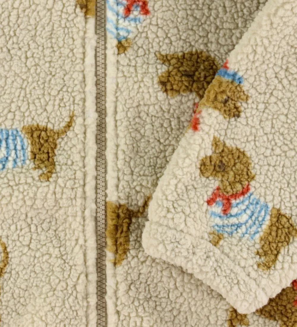 Charmerende Konges Sløjd fleecejakke i beige teddyfleece dekoreret med et mønster af brune hunde iklædt farverige trøjer. Fleecejakken har en dejlig melemhøj hals og lange ærmer, som giver et klassisk look.