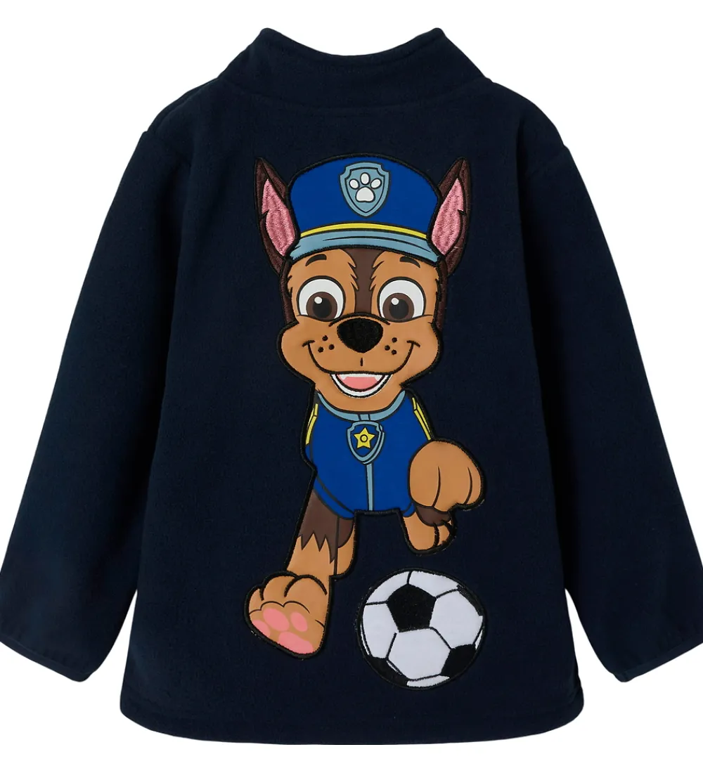 Stilren Name It fleecejakke i dyb marineblå med teksten “Pawsome Goal” broderet i hvid på brystet.