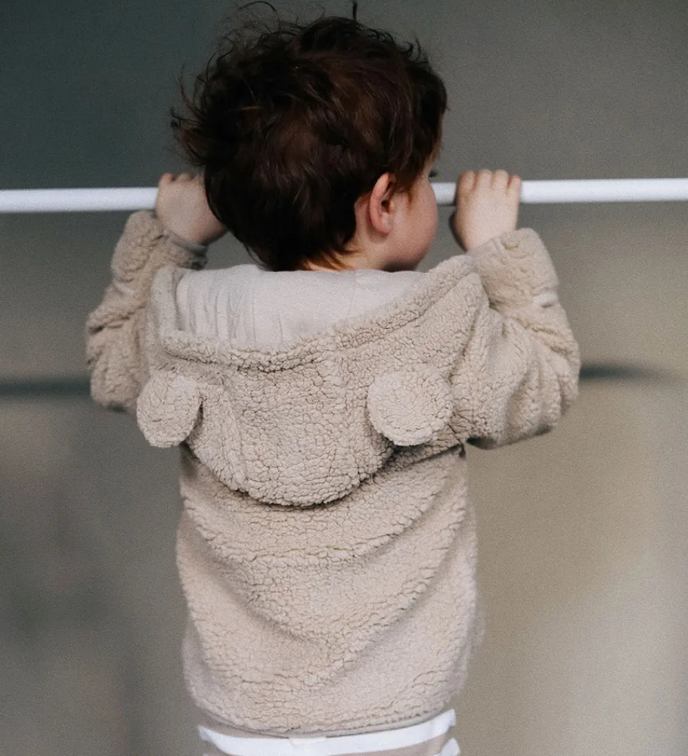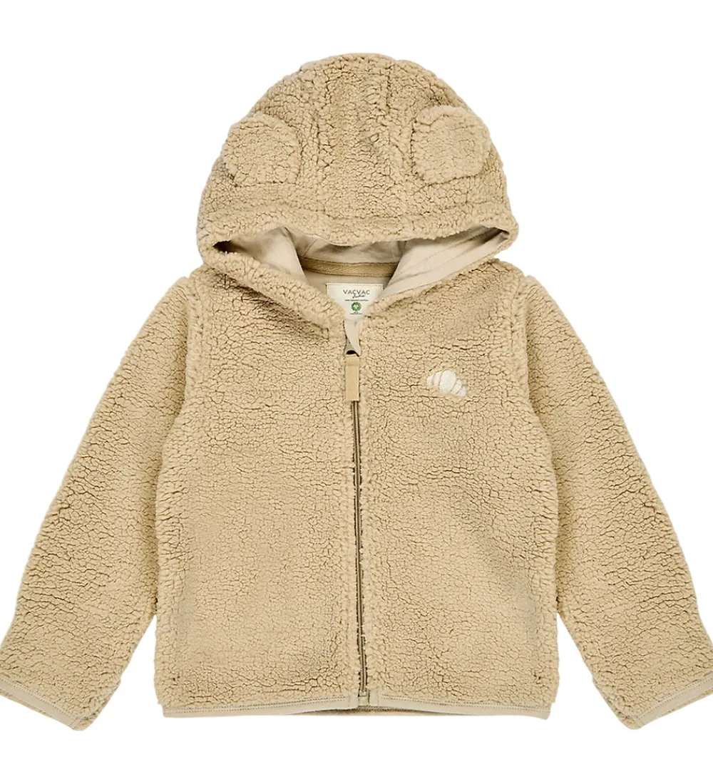 Indbydende VACVAC fleecejakke i en varm beige nuance. Fleecejakken er lavet af blødt teddyfleece og har en hætte med små ører, der tilføjer et sødt touch.