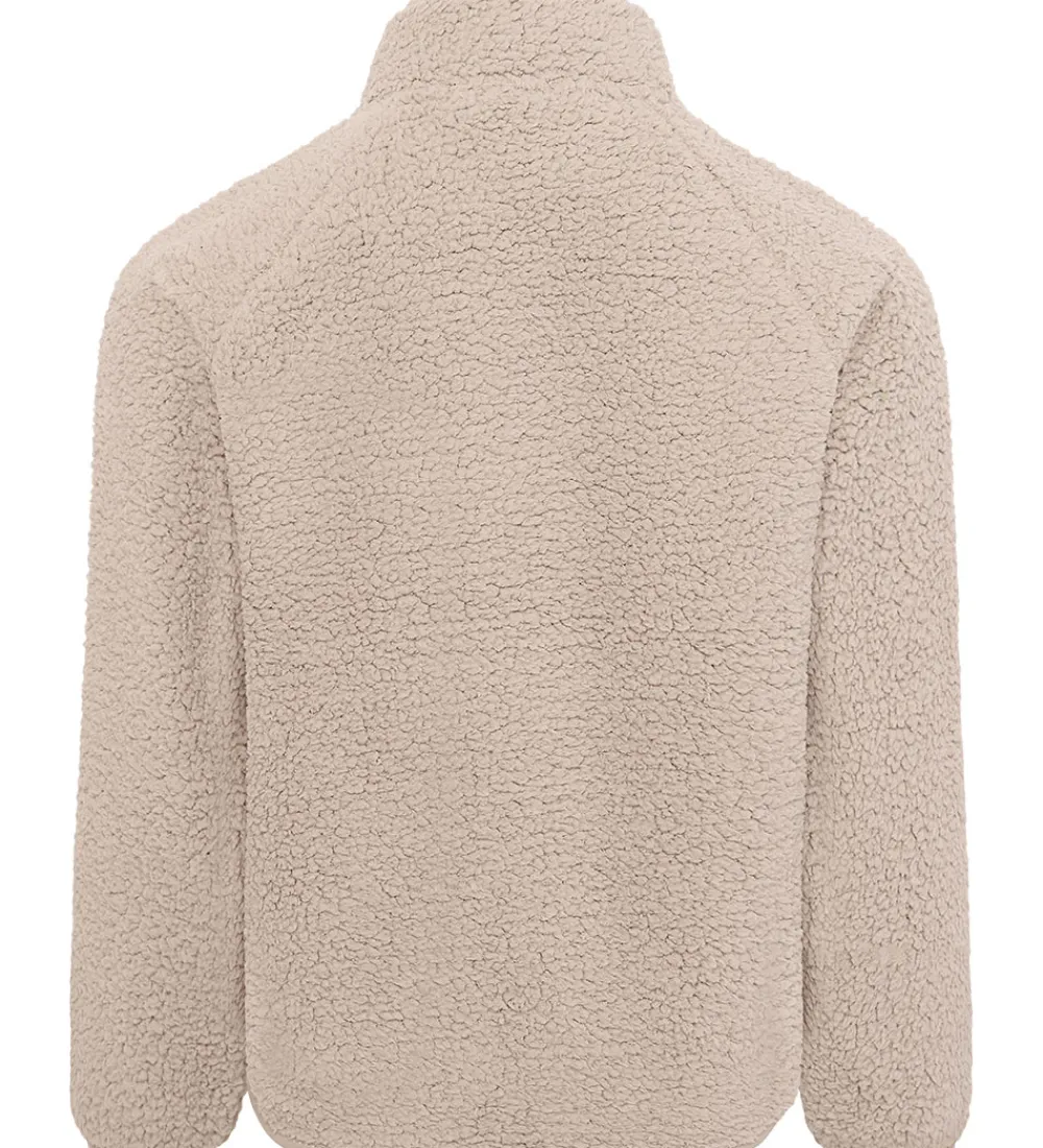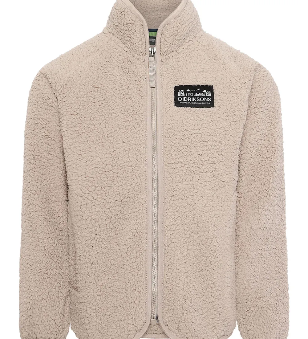 Dejlig Didriksons fleecejakke i beige teddy fleece med en sort og hvid logo-patch på venstre bryst.