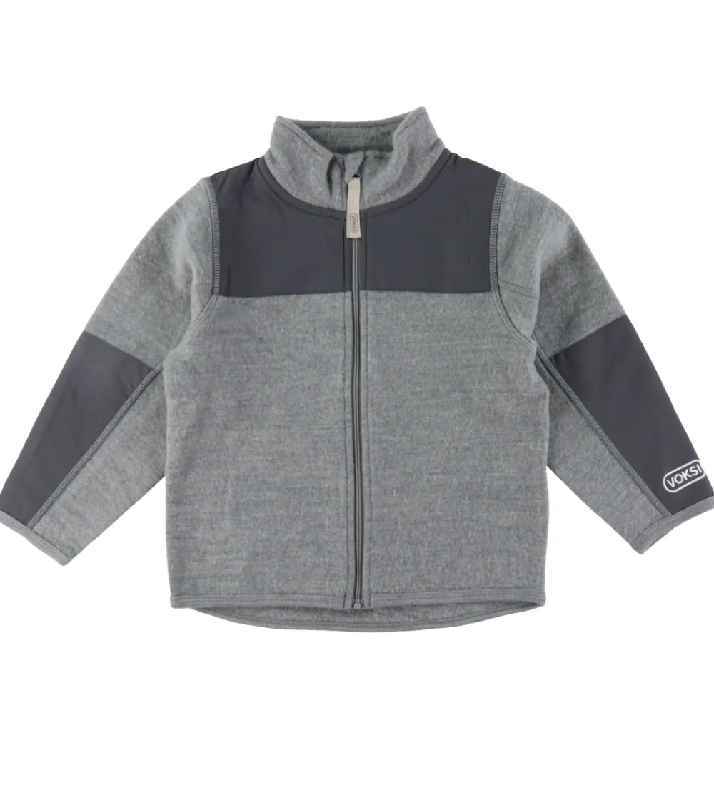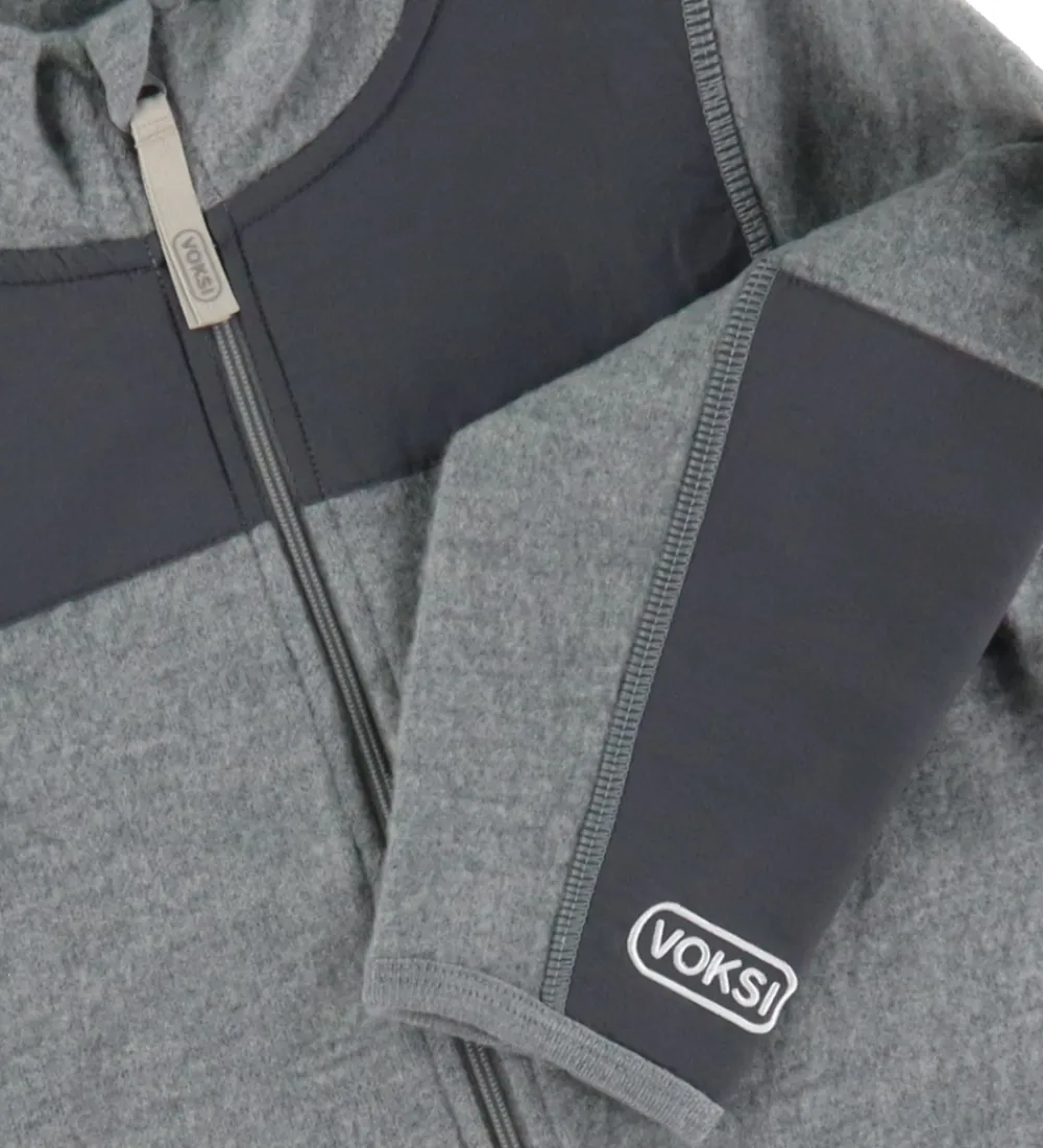Lækker fleecejakke af uld fra Voksi med lange ærmer i meleret grå og med detaljer af glatvævet nylon. Fleecejakken har en lynlås foran og Voksi-logoet på ærmet, hvilket giver et stilfuldt touch.