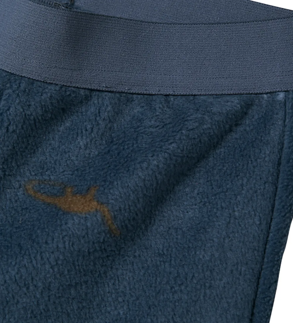 Charmerende Name It fleecesæt i en mørkeblå nuance med små dinoer i forskellige farver spredt over hele overfladen. Sættet består af en fleecetrøje og et par fleecebukser.