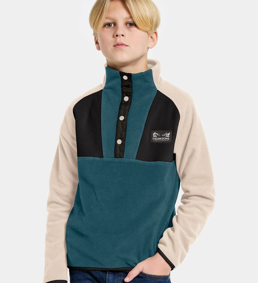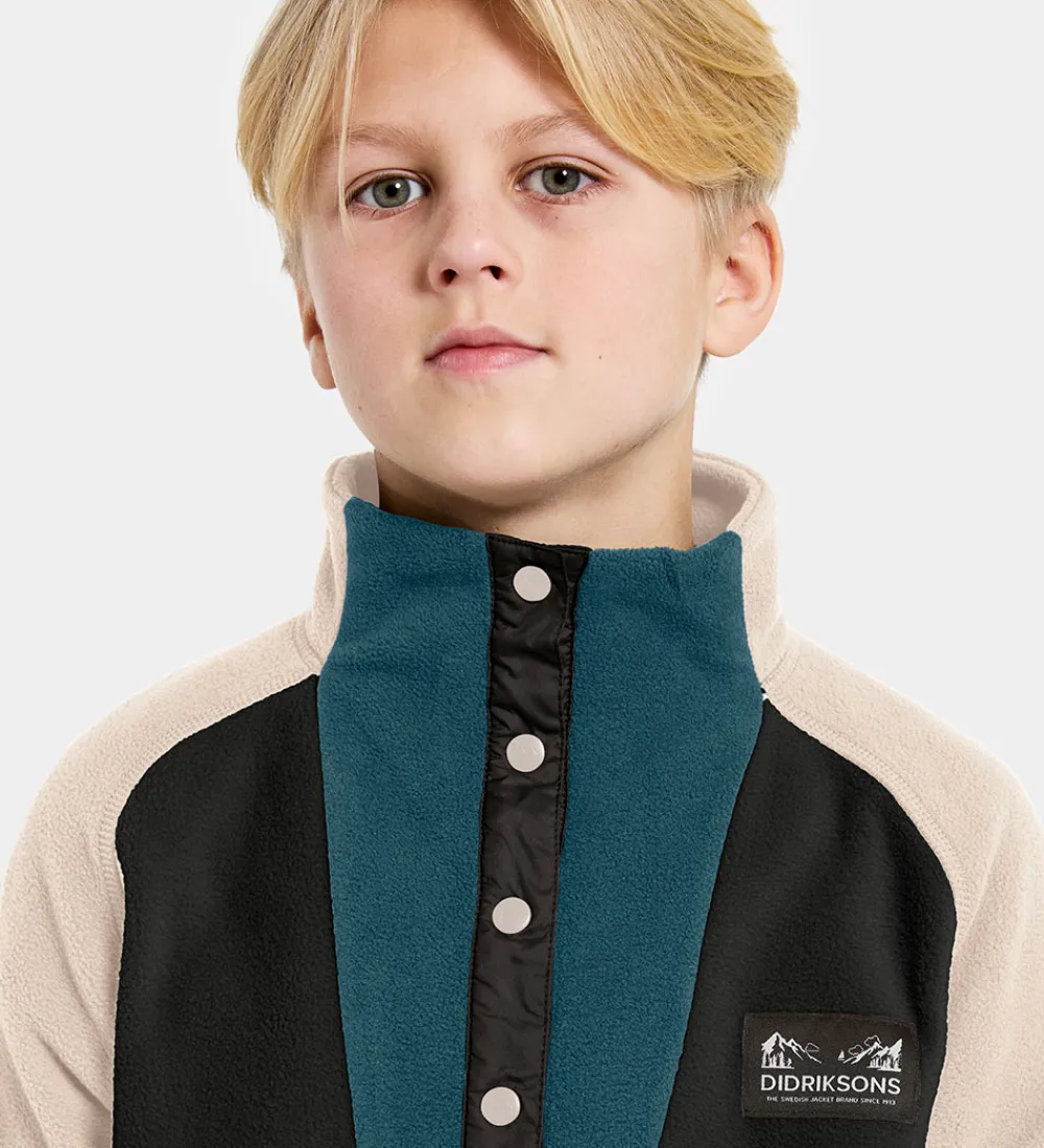 Skøn Didriksons fleecetrøje med en kombination af petroleumsblå, sort og beige. Fleecetrøjen har smalle, elastiske kanter og en høj hals. Fleecetrøjen åbnes i toppen med trykknapper.