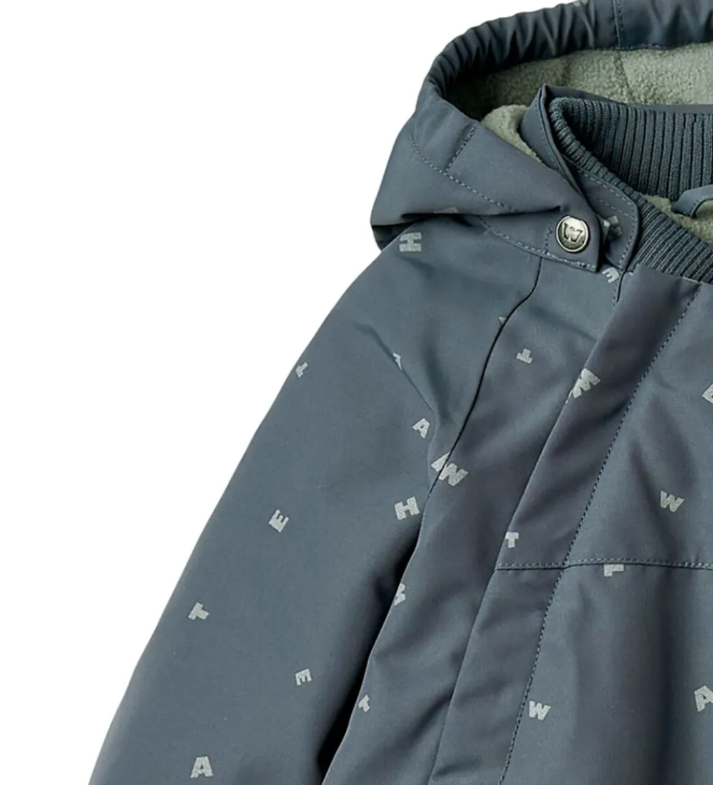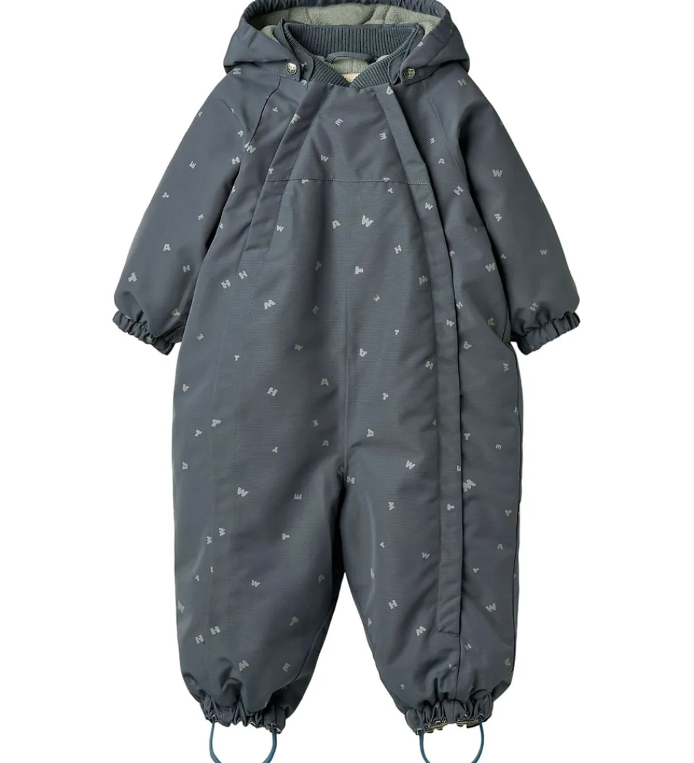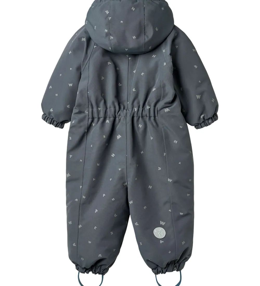 Sød Wheat flyverdragt i gråblå med alloverprint af bogstaver fra brandets navn. Flyverdragten rummer også både reflekspipings og -print.