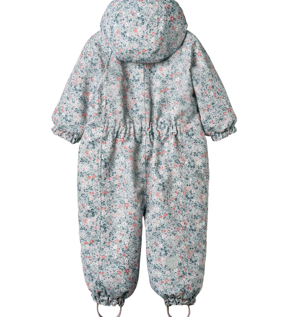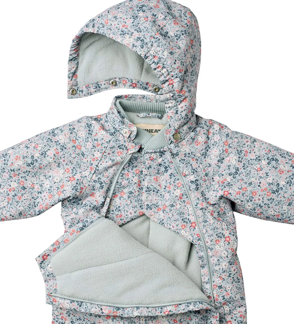Sød Wheat flyverdragt i støvet, lys blå med et alloverblomsterprint i rosa, røde, hvide og blå farver. Flyverdragten rummer også både reflekspipings og -print.