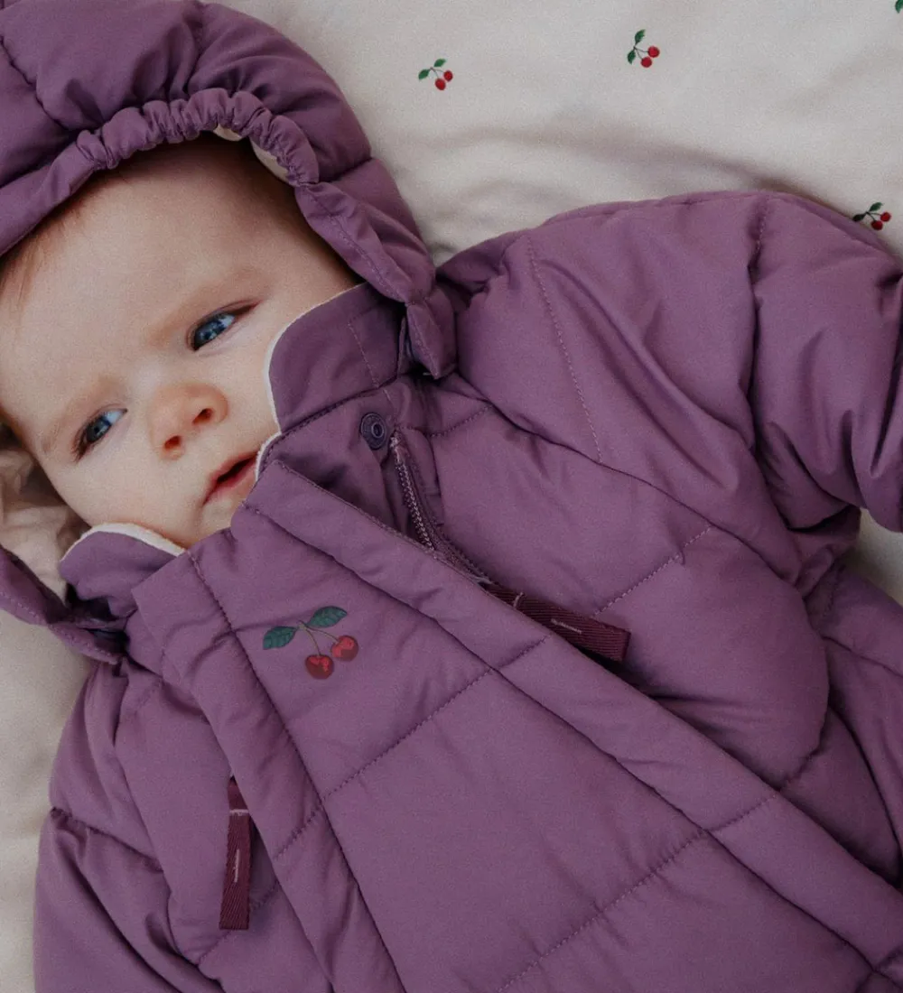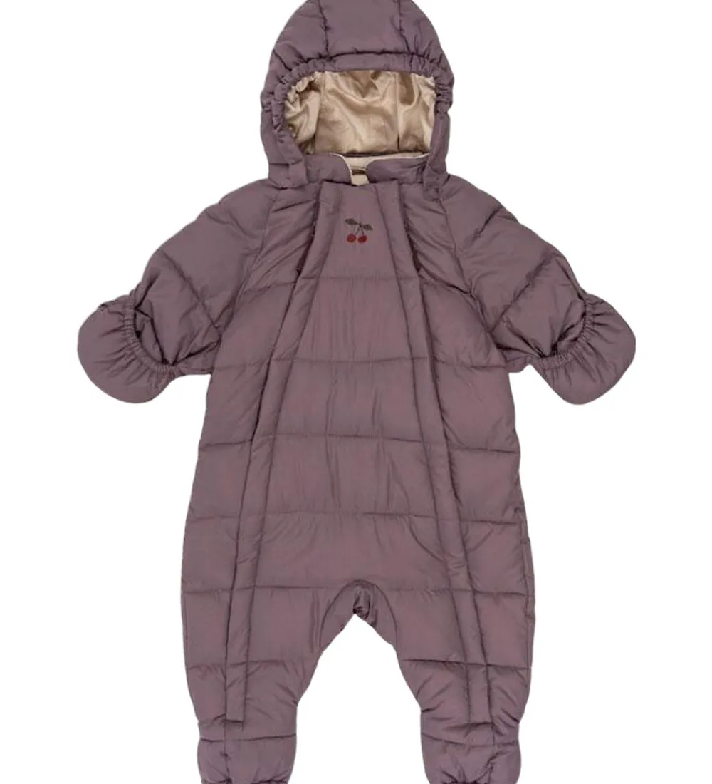 Smart Konges Sløjd flyverdragt i en støvet lilla og med et lille kirsebærprint samt vandrette syninger.