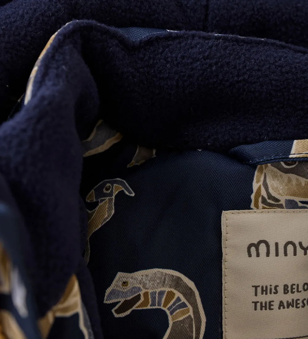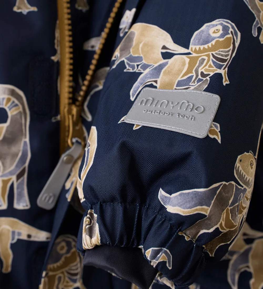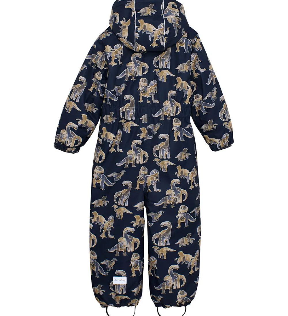 Smart Minymo flyverdragt i mørkeblå med et alloverprint af dinosaurer i blå og grønne nuancer. Flyverdragten har praktiske refleksdetaljer.