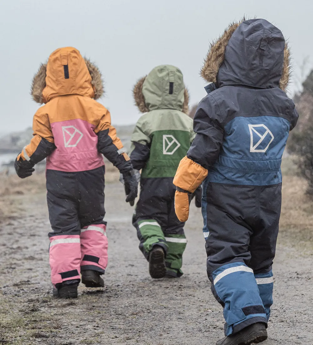 Flot Didriksons flyverdragt i pink, karrygul og navyblå og med et broderet, hvidt logo på venstre bryst. Flyverdragten har velplacerede, praktiske reflekser.