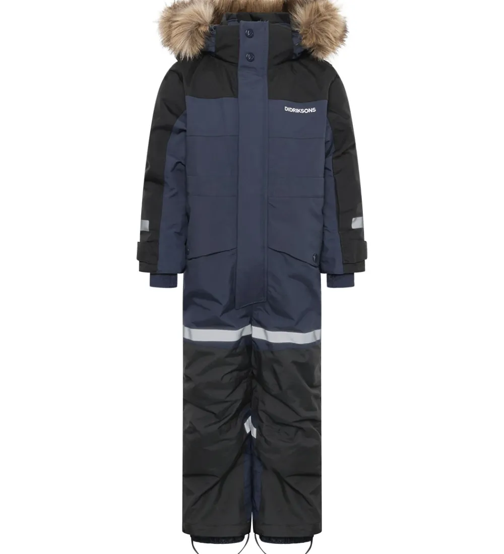 Flot Didriksons flyverdragt i navyblå og sort og med et broderet, hvidt logo på venstre bryst. Flyverdragten har velplacerede, praktiske reflekser.