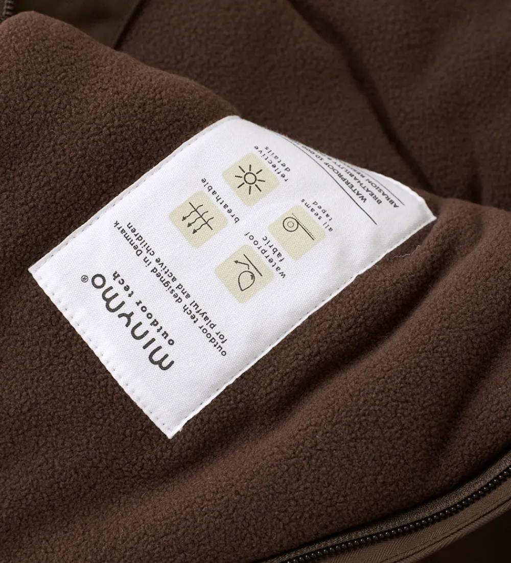 Minymo flyverdragten er godt vatteret, og indvendigt er den foret med fleece overalt på nær i ærmerne og yderst i benene, som har et glatvævet for.