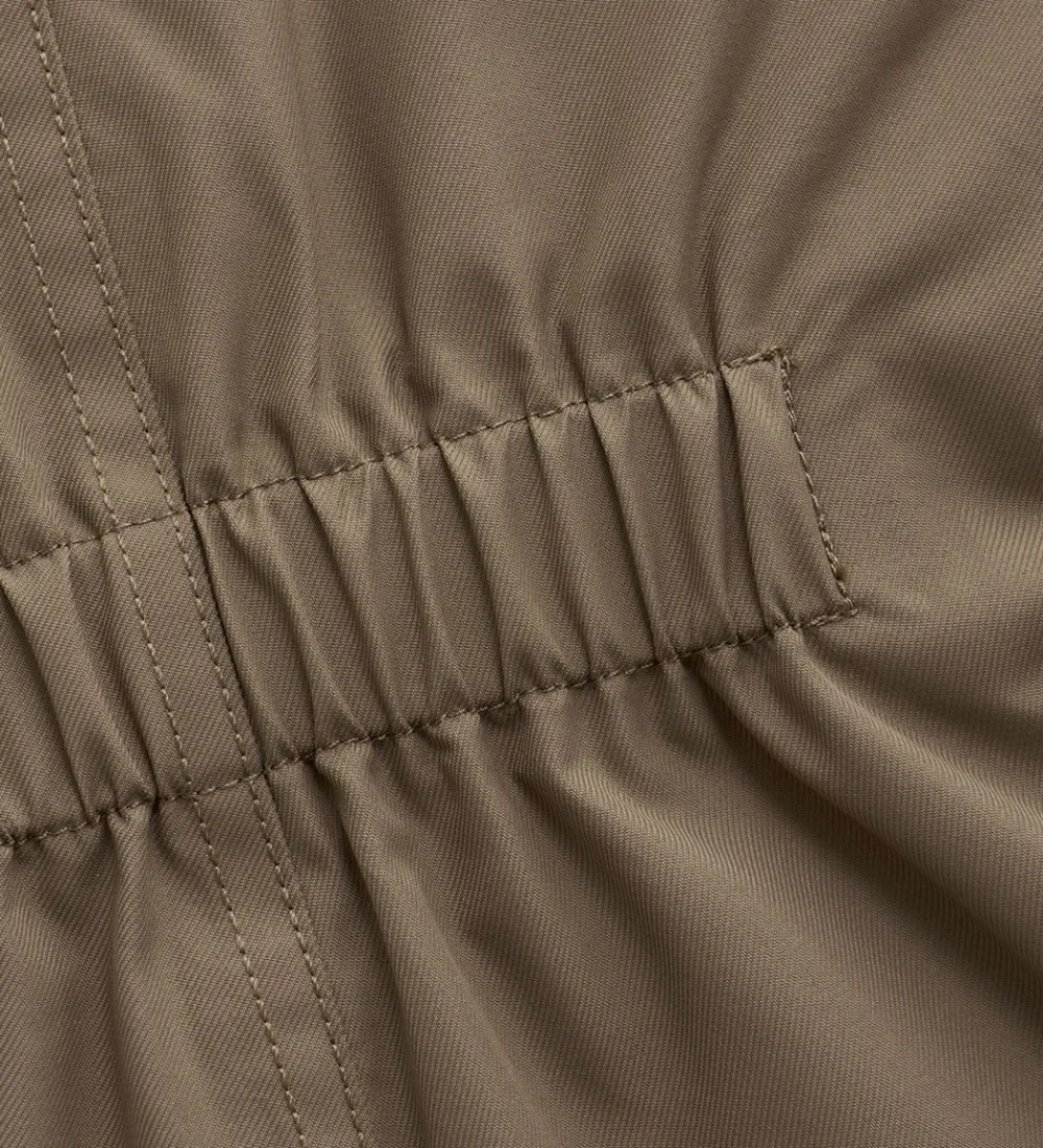 Flyverdragten åbnes fortil ved hjælp af en skrå lynlås, som lynes ned til midt på venstre ben. Lynlåsen har hagebeskytter og dobbelt vindstolpe.