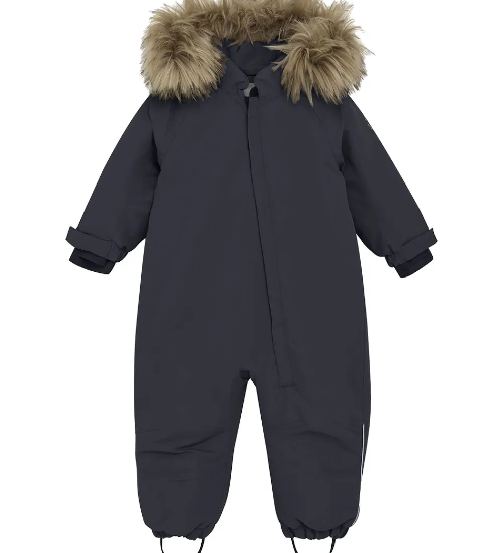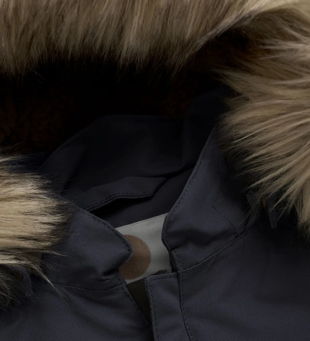 En Fant flyverdragten åbnes fortil ved hjælp af en skrå lynlås med en fleeceforet hagebeskytter og indvendig vindstolpe. Flyverdragten er justeret med en elastikindsats i ryggen.