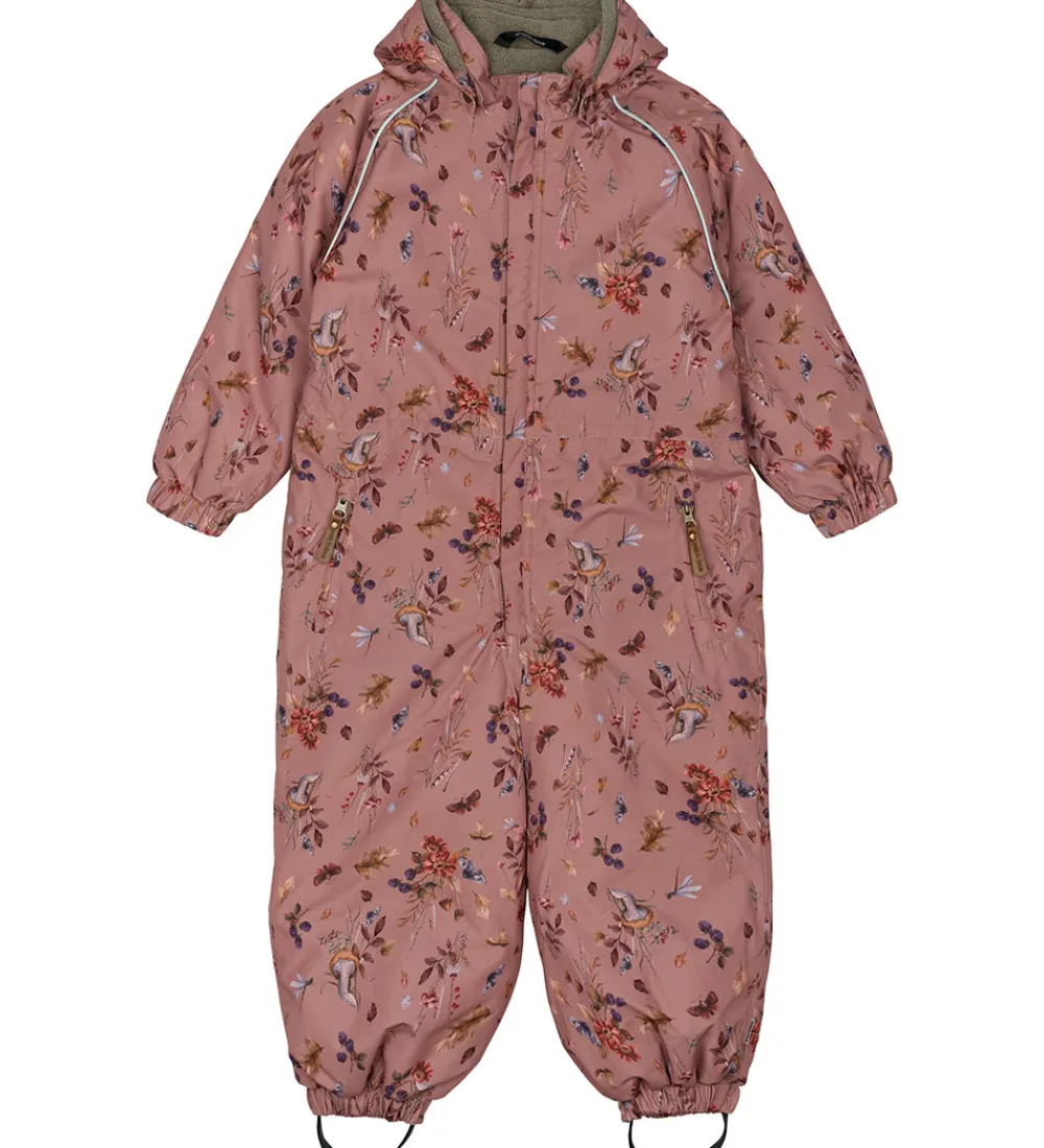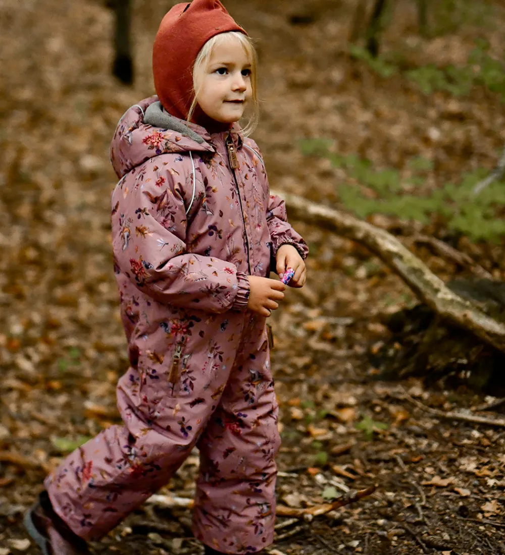 Fin Mikk-Line flyverdragt i rosa med efterårsprint af blomster, svampe og insekser. Flyverdragten har refleksdetaljer langs skuldrene, på venstre ærmer og på hætten.