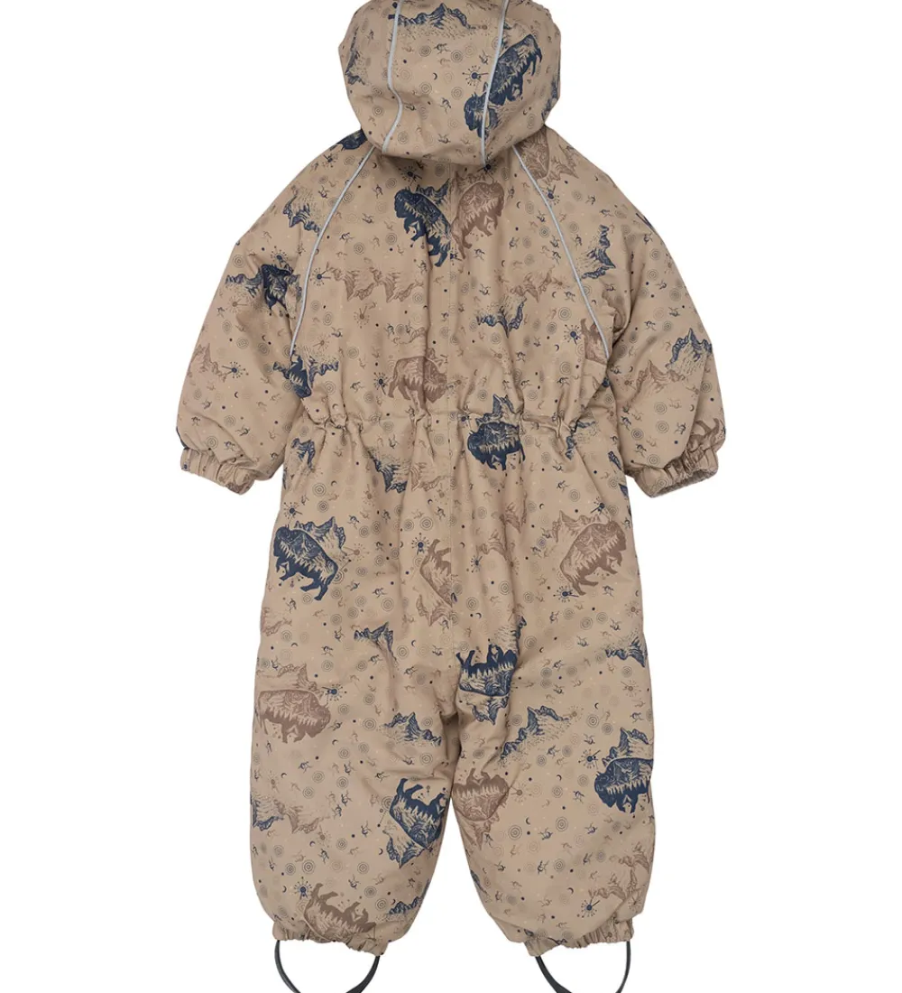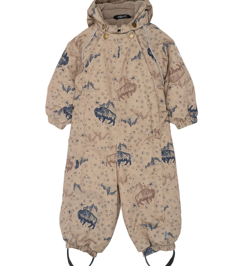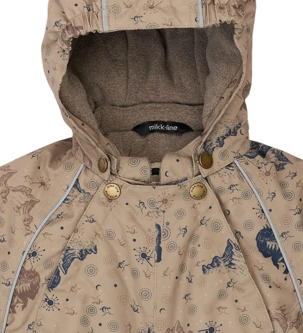 Fin Mikk-Line flyverdragt i støvet grøn med et alloverprint med bl.a. bisonokser og klippeformationer brune og blå farver. Flyverdragten har praktiske refleksdetaljer langs skuldrene, på venstre ærme og langs oversiden af hætten.