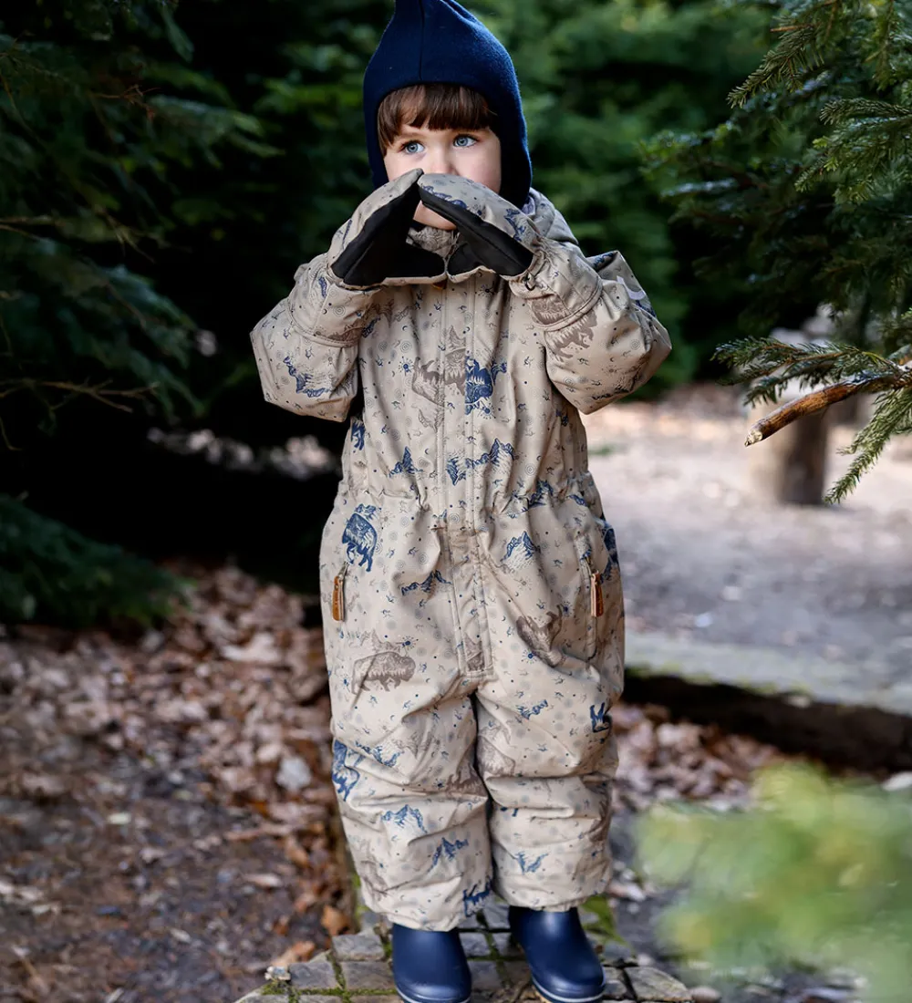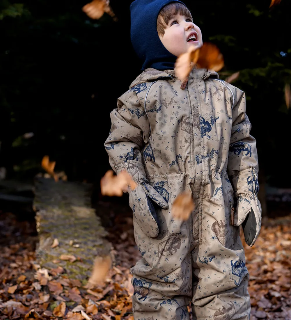 Fin Mikk-Line flyverdragt i støvetgrøn med et alloverprint med bl.a. bisonokser og klippeformationer brune og blå farver. Flyverdragten har refleksdetaljer langs skuldrene, på venstre ærmer og på hætten.