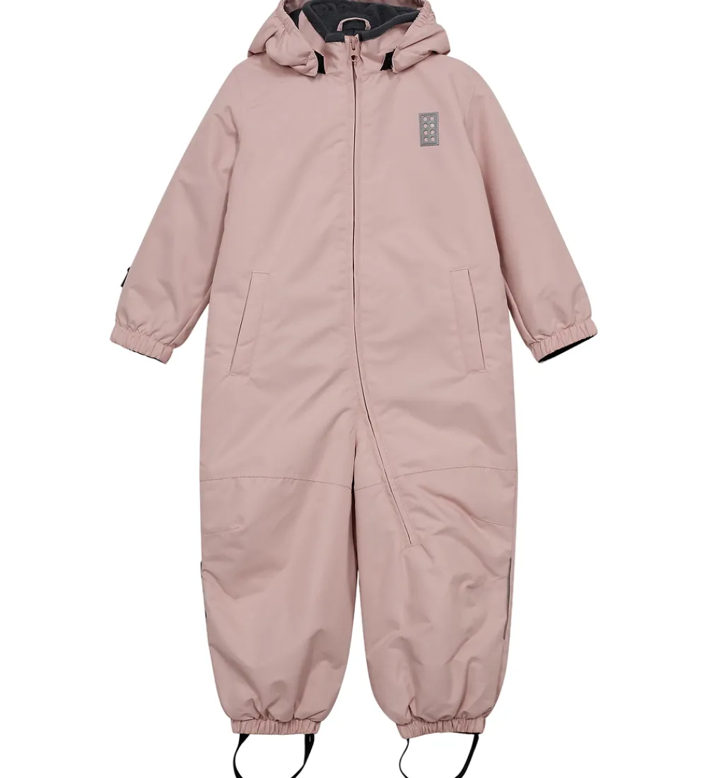 LEGO® Wear flyverdragten har en aftagelig hætte, som sidder fast med skjulte trykknapper lang den fleeceforede halskrave. Ærmerne har fleeceforede elastikkanter. Ærmerne har også et smart klikspænde, hvor barnets LEGO® Wear luffer eller handsker kan sættes fast, og i benåbningerne er der selvfølgelig også aftagelige støvlestropper. I lænden er den justeret ind med en elastik.