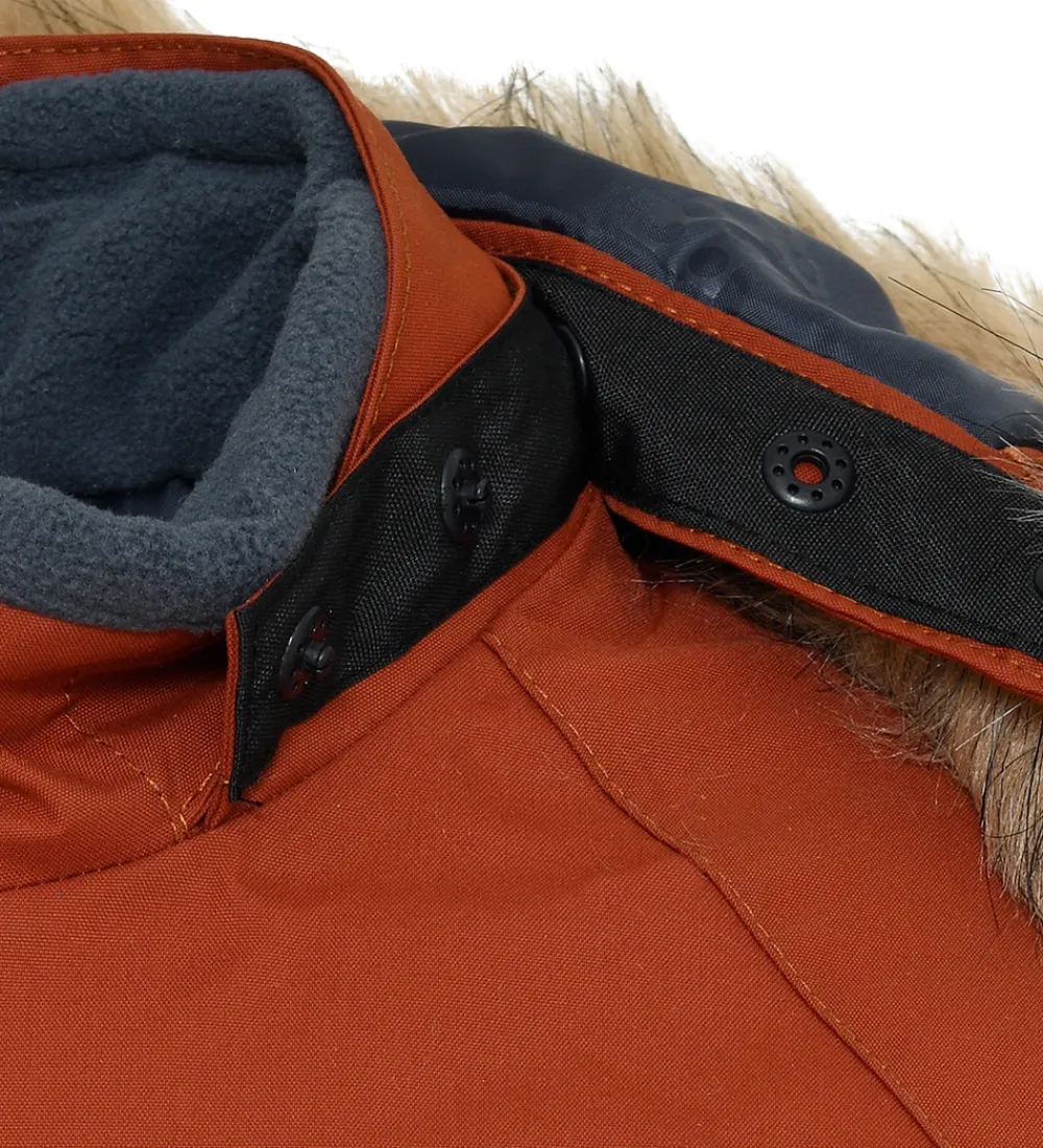 LEGO® Wear flyverdragten har en aftagelig hætte, som fæstnes med trykknapper langs den fleeceforede halskrave. Hætten har en flot, imiteret pelskant, der kan tages af ved hjælp af skjulte knapper. I både arm- og benåbninger er der elastikkanter, og i armåbningerne er de endda forede med fleece. Ærmerne har også et smart klikspænde, hvor barnets LEGO® Wear luffer eller handsker kan sættes fast, og i benåbningerne er der selvfølgelig også aftagelige støvlestropper i gummi.