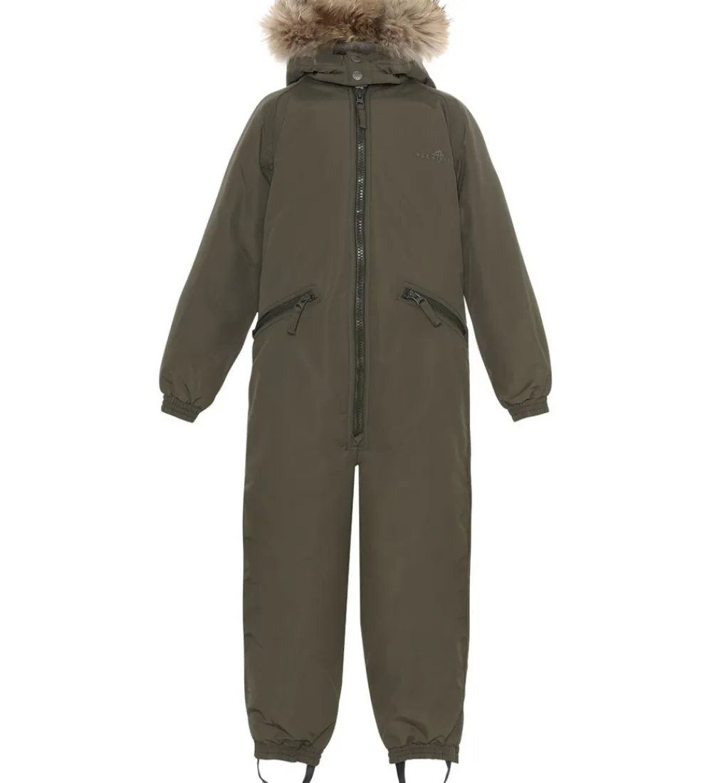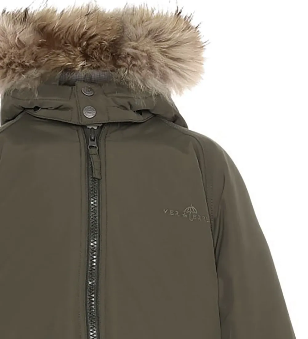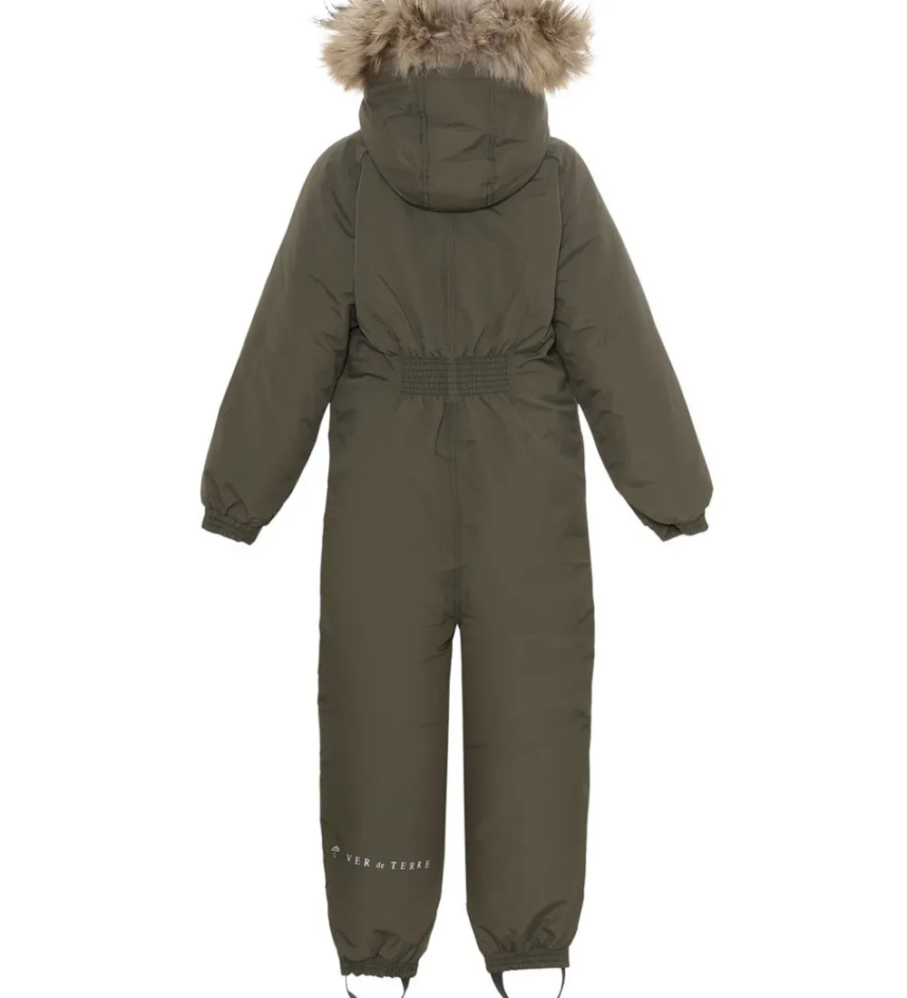 Lækker Ver de Terre flyverdragt i ensfarvet mørk armygrøn, og fortil i højre side er der broderet et diskret logo. Flyverdragten har en hætte med en flot kant af pels.