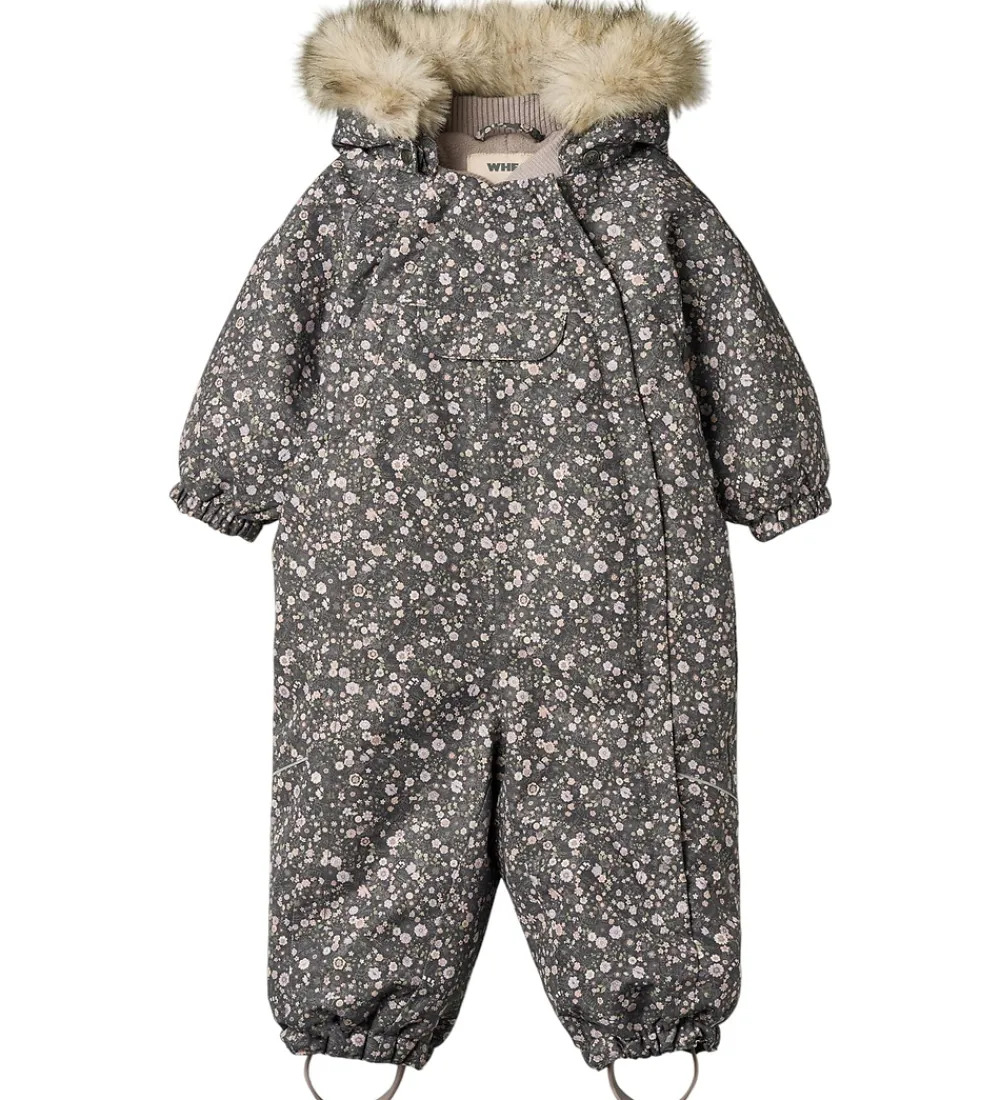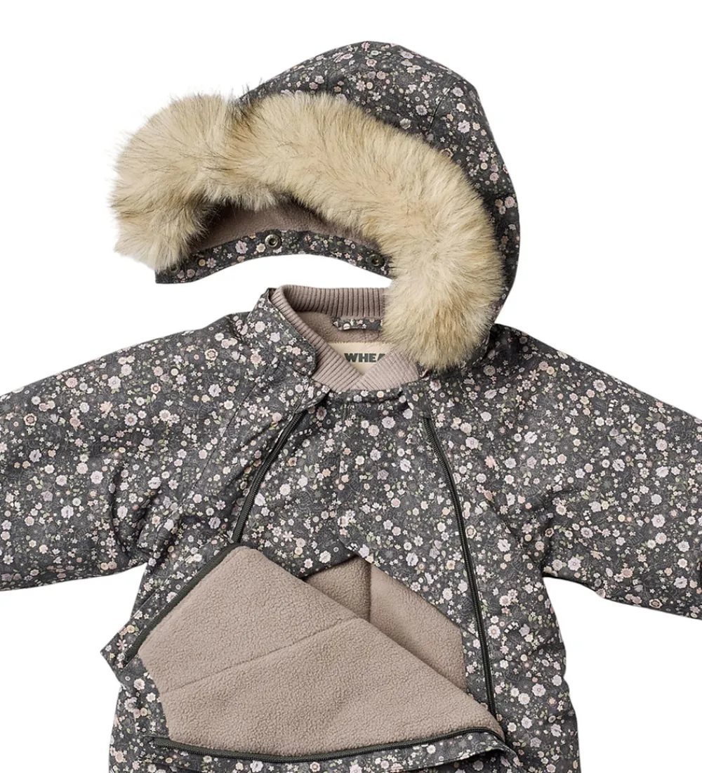 Skøn Wheat flyverdragt i mørk koksgrå med et alloverblomsterprint i støvede lilla, rosa og grønne nuancer og med en flot kant af imiteret pels på hætten. Flyverdragten rummer også både reflekspipings og -print.