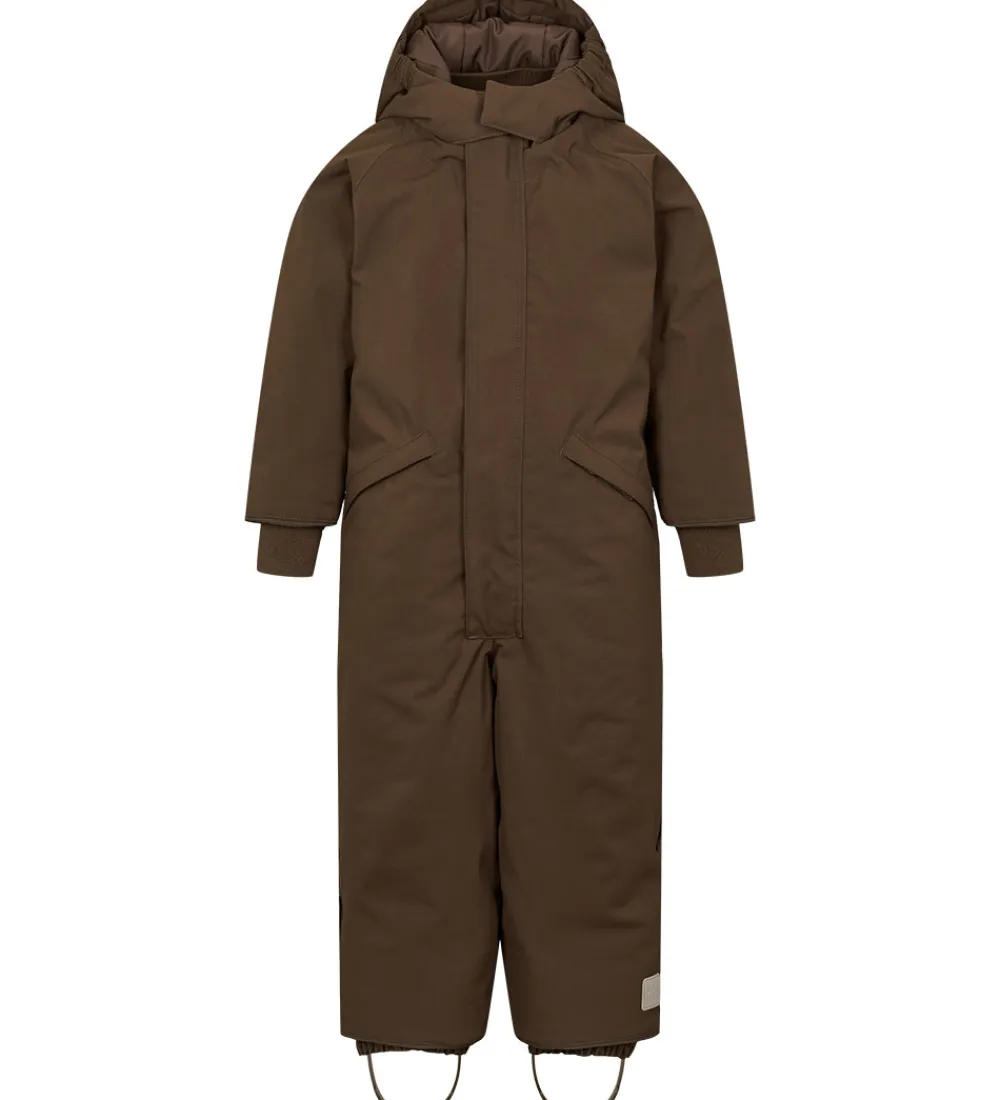 Skøn MarMar flyverdragt i mørkebrun med praktiske refleksdetaljer langs ærmerne og benene.