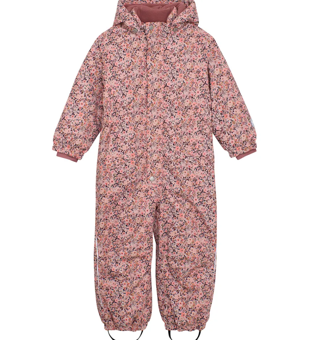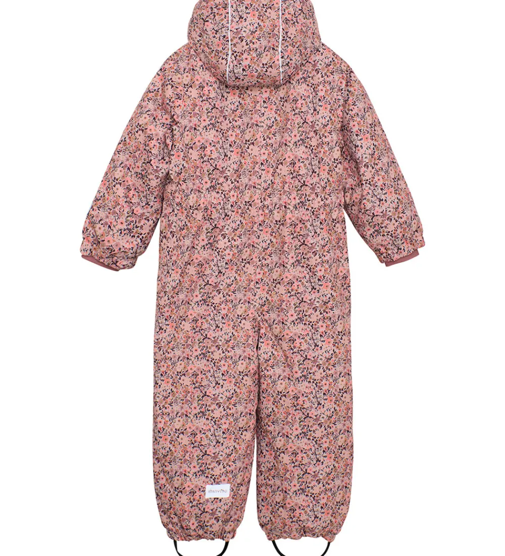 Smart Minymo flyverdragt i rosa med et alloverprint af blomster i lilla, brune og rosa nuancer. Flyverdragten har praktiske refleksdetaljer.