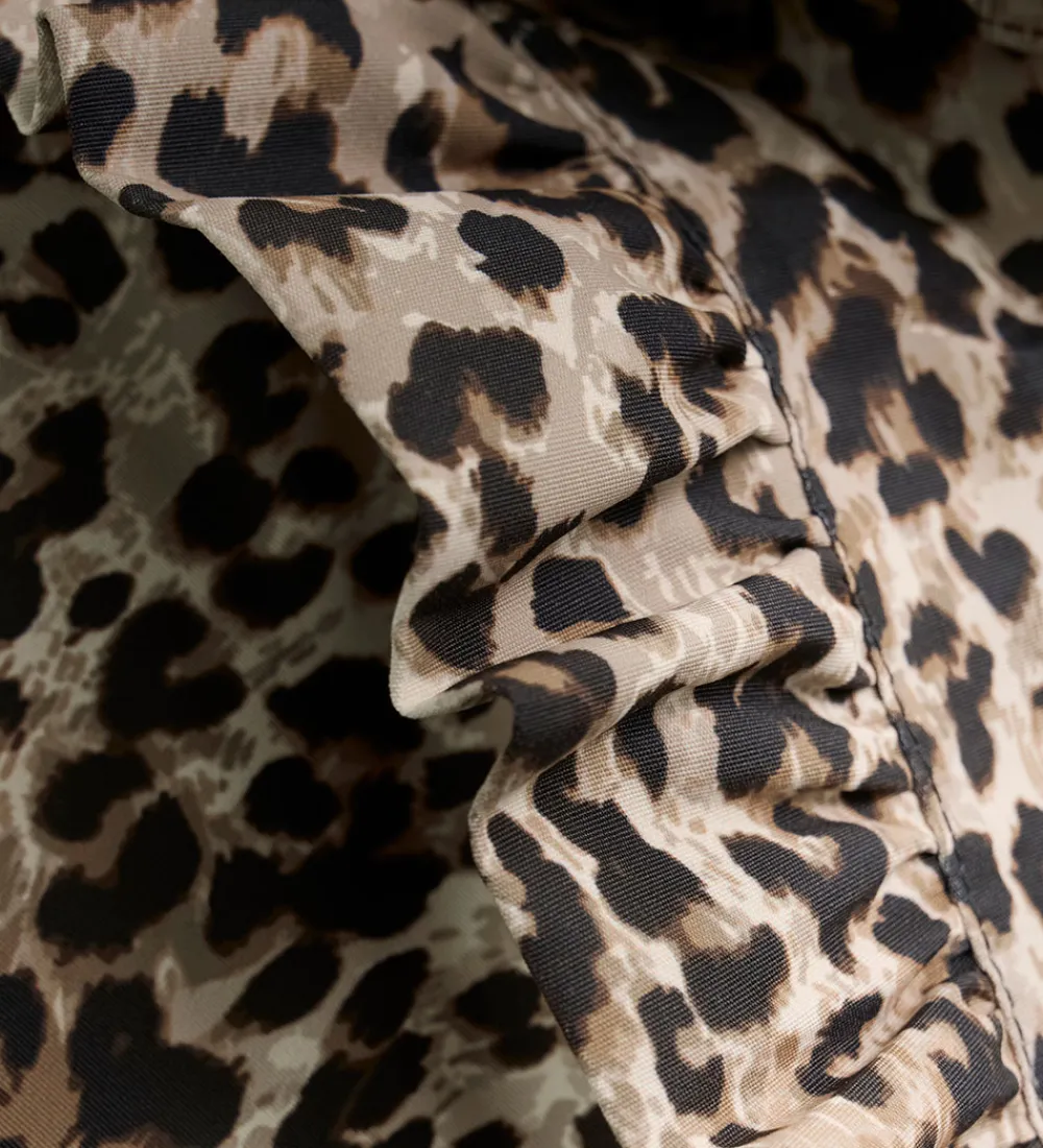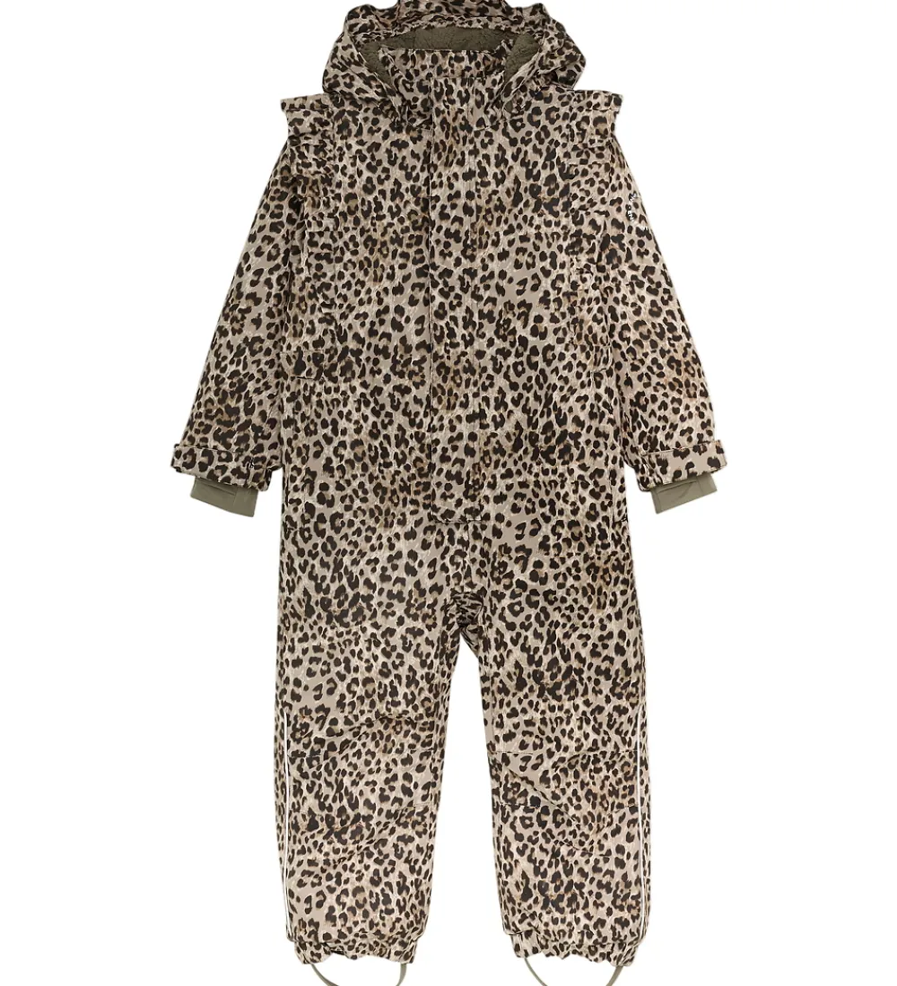 Pæn En Fant flyverdragt med et leopardmønster i sort og beige. Flyverdragten er med refleksprint og -pipings og har flotte flæser over skuldrene.