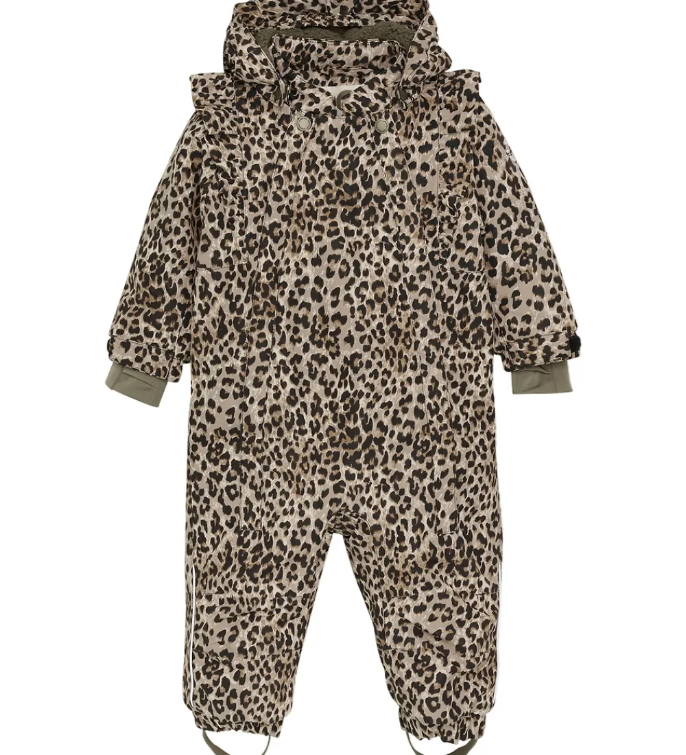 Dejlig En Fant flyverdragt med leopardprint i sort og beige. Flyverdragten er med refleksprint og -pipings og har flotte flæser over skuldrene.