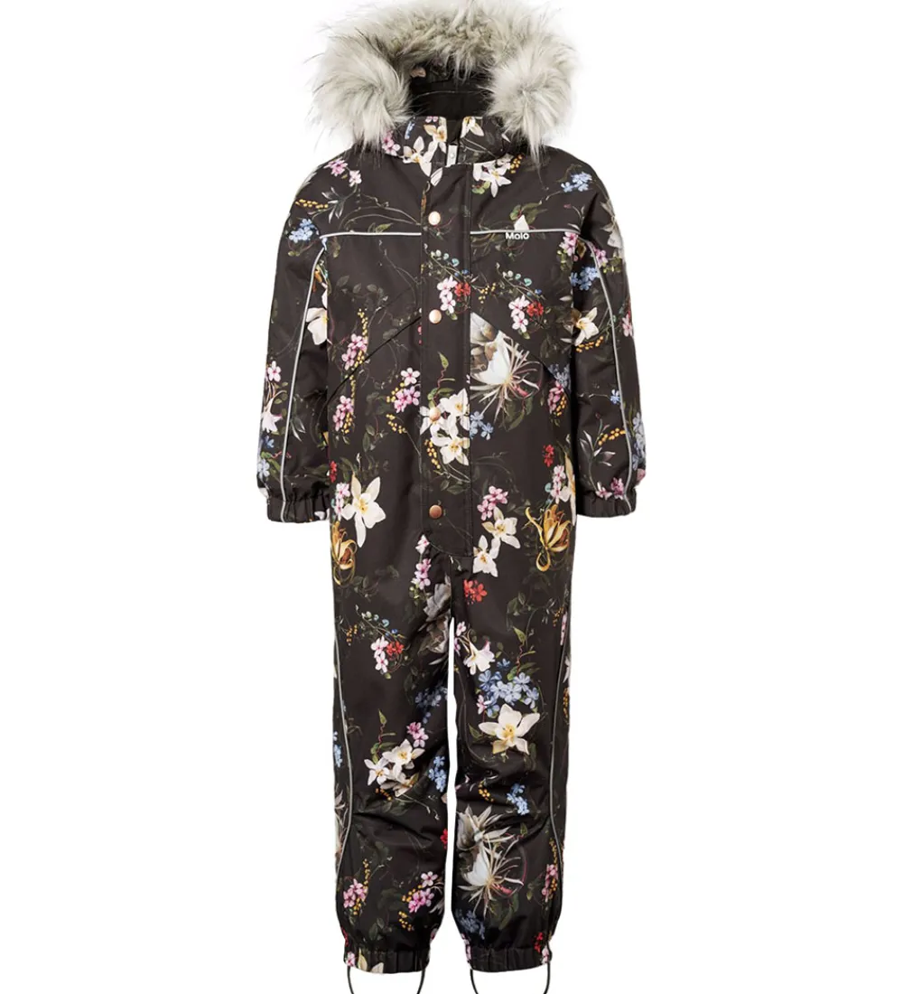 Smart Molo flyverdragt i sort med et smuk og farverigt alloverblomsterprint. Flyverdragten er udstyret med store stjernereflekser og reflekspipings.