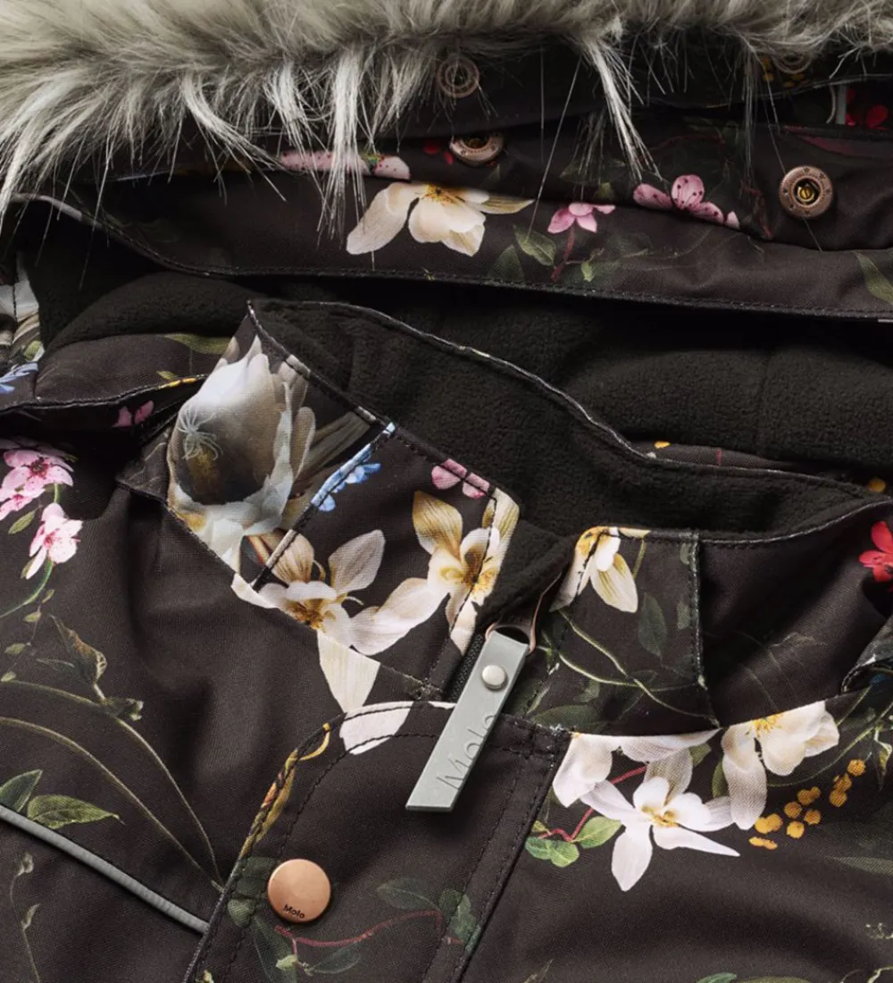 Molo flyverdragten har en aftagelig hætte, der fæstnes med velcro og trykknapper langs den høje halskrave. Hætten har en flot, imiteret pelskant, der kan knappes af med skjulte trykknapper. Ærmerne har elastikkanter, og benåbningerne har elastikkanter med snefang og justerbare, aftagelige støvlestropper i gummi.