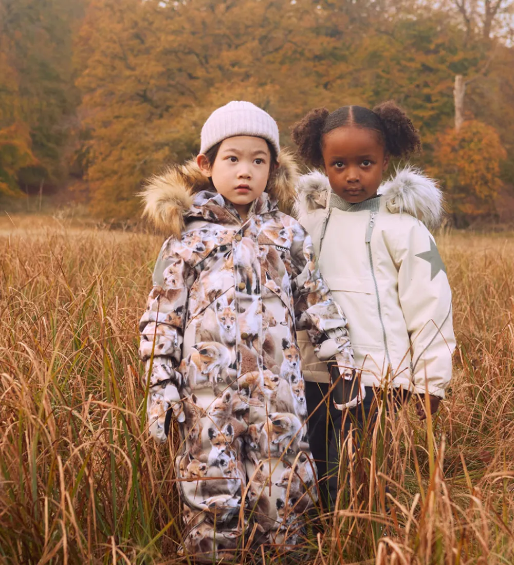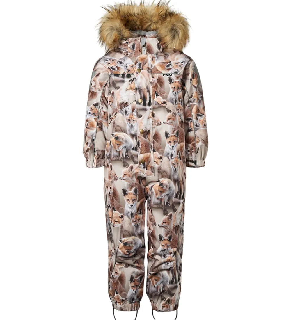 Smart Molo flyverdragt med et hyggeligt alloverprint af legende ræve. Flyverdragten er udstyret med store stjernereflekser og reflekspipings.