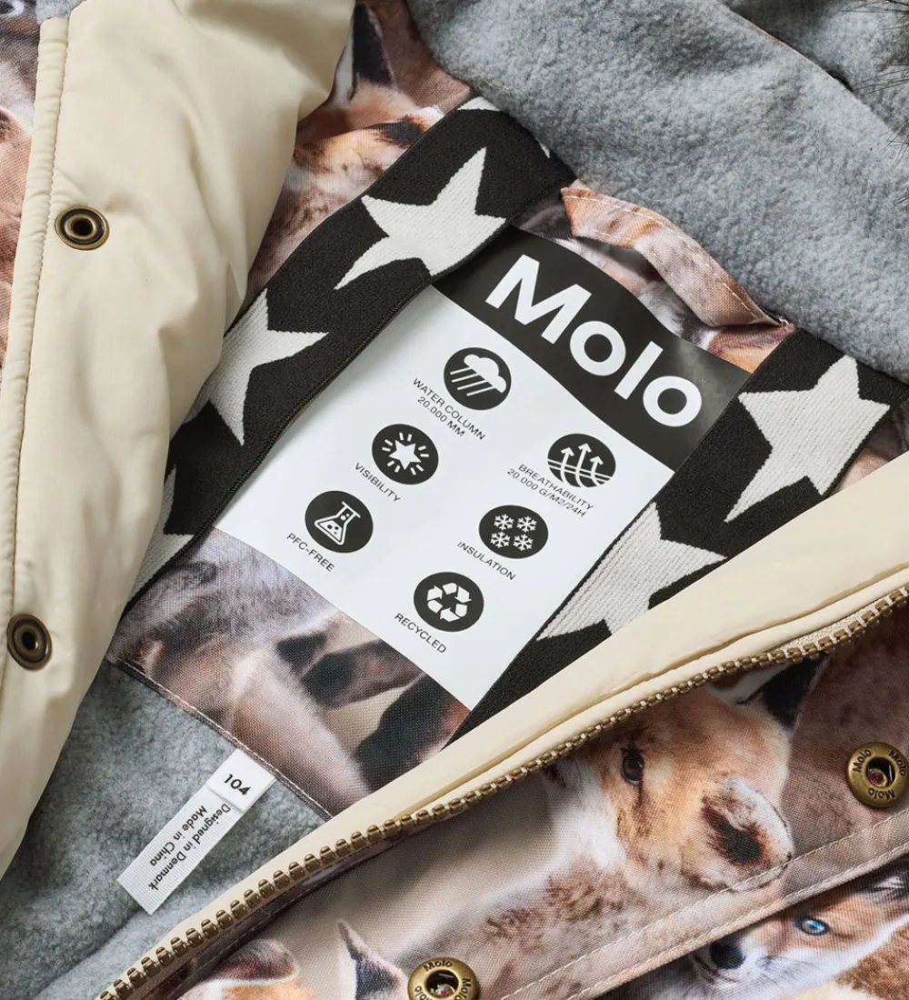 Molo flyverdragten har en aftagelig hætte, der fæstnes med velcro og trykknapper langs den høje halskrave. Hætten har en flot, imiteret pelskant, der kan knappes af med skjulte trykknapper. Ærmerne har elastikkanter, og benåbningerne har elastikkanter med snefang og justerbare, aftagelige støvlestropper i gummi.