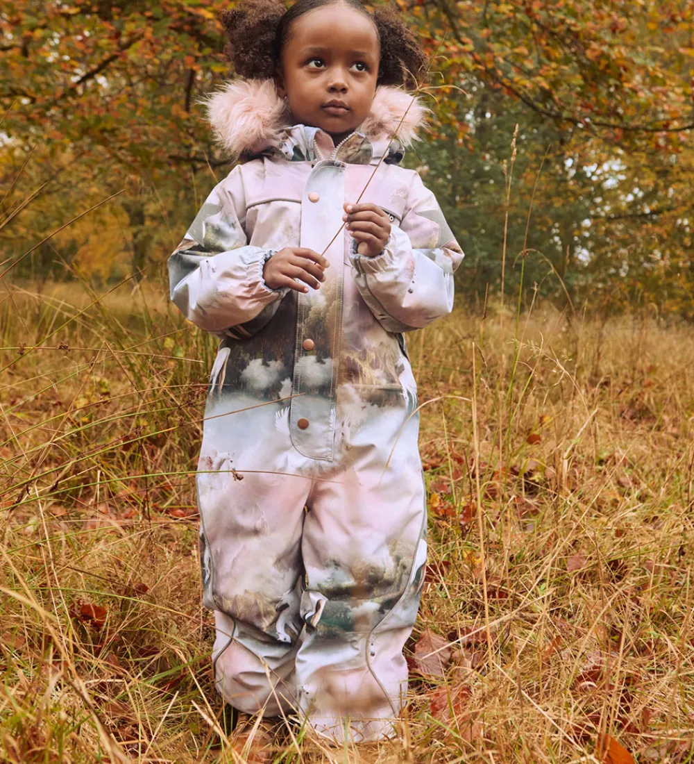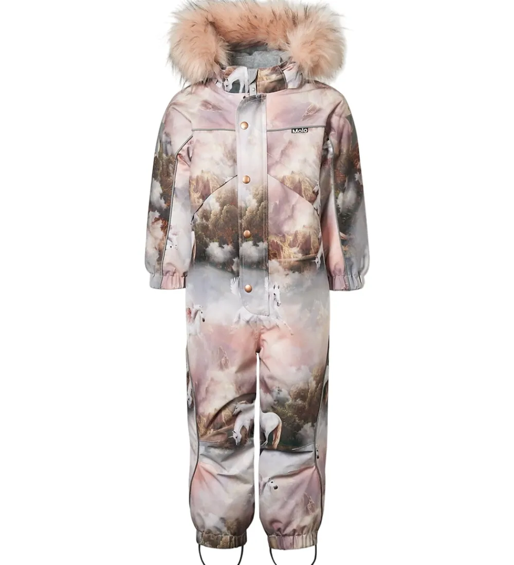 Smart Molo flyverdragt med et udtryk af rosa og grå nuancer med et smukt landskabsprint med enhjørninger. Flyverdragten er udstyret med store stjernereflekser og reflekspipings.