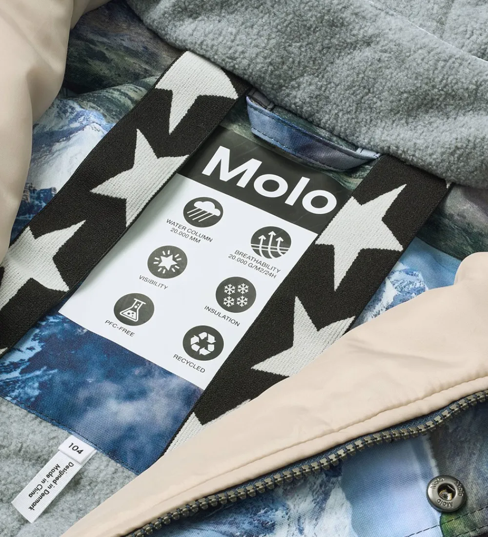 Molo flyverdragten har en aftagelig hætte, der fæstnes med velcro og trykknapper langs den høje halskrave. Hætten har elastikkant i ansigtsåbningen. Ærmerne har fleeceforede elastikkanter, og benåbningerne har elastikkanter med snefang og justerbare, aftagelige støvlestropper i gummi.