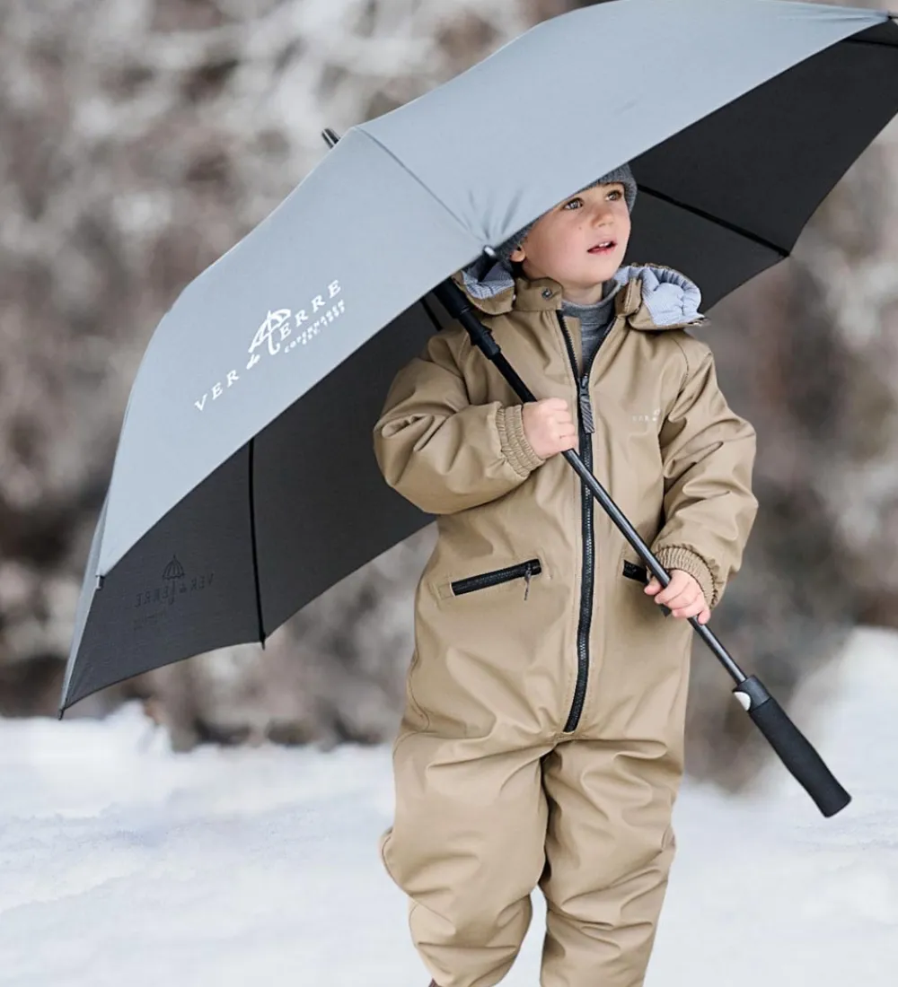Lækker Ver de Terre flyverdragt i ensfarvet lysebrun med en vandtæt PU-overflade og med sorte lynlåse.