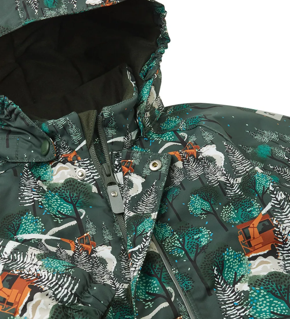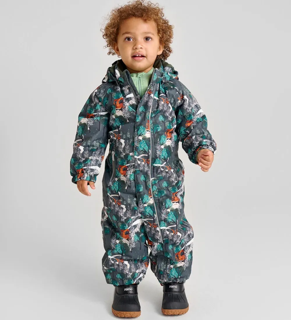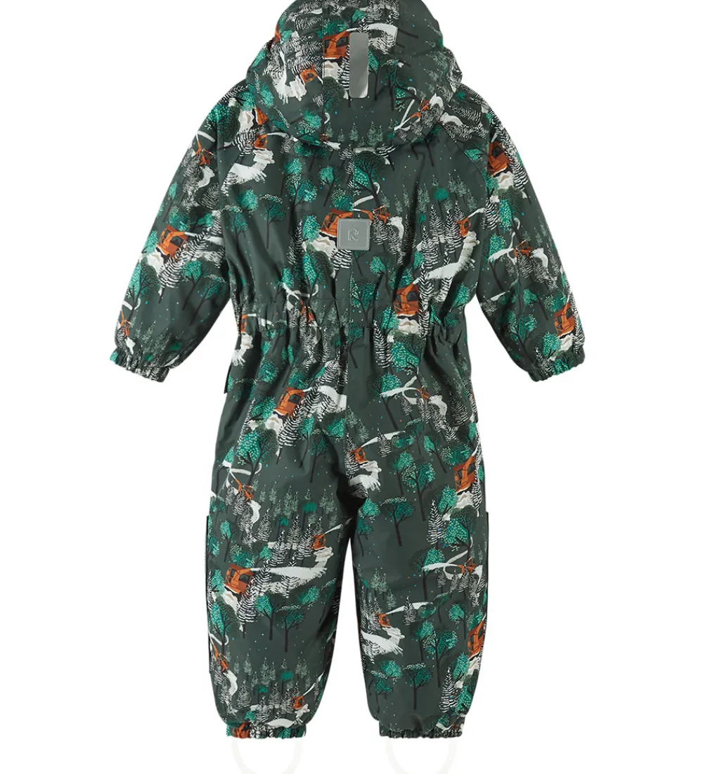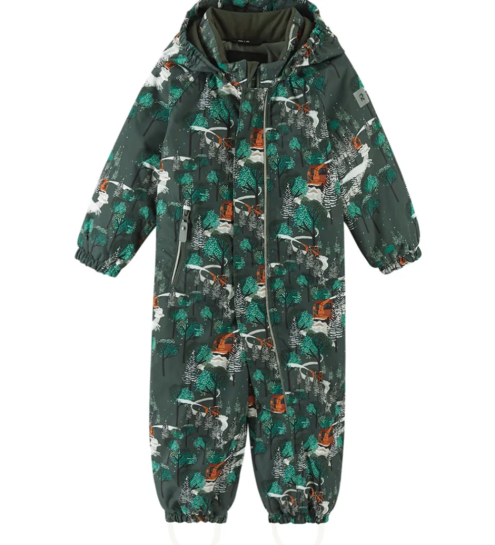 Skøn Reima flyverdragt i mørk, støvet grøn med et allover-skovprint med brune sneryddere og hvid sne.