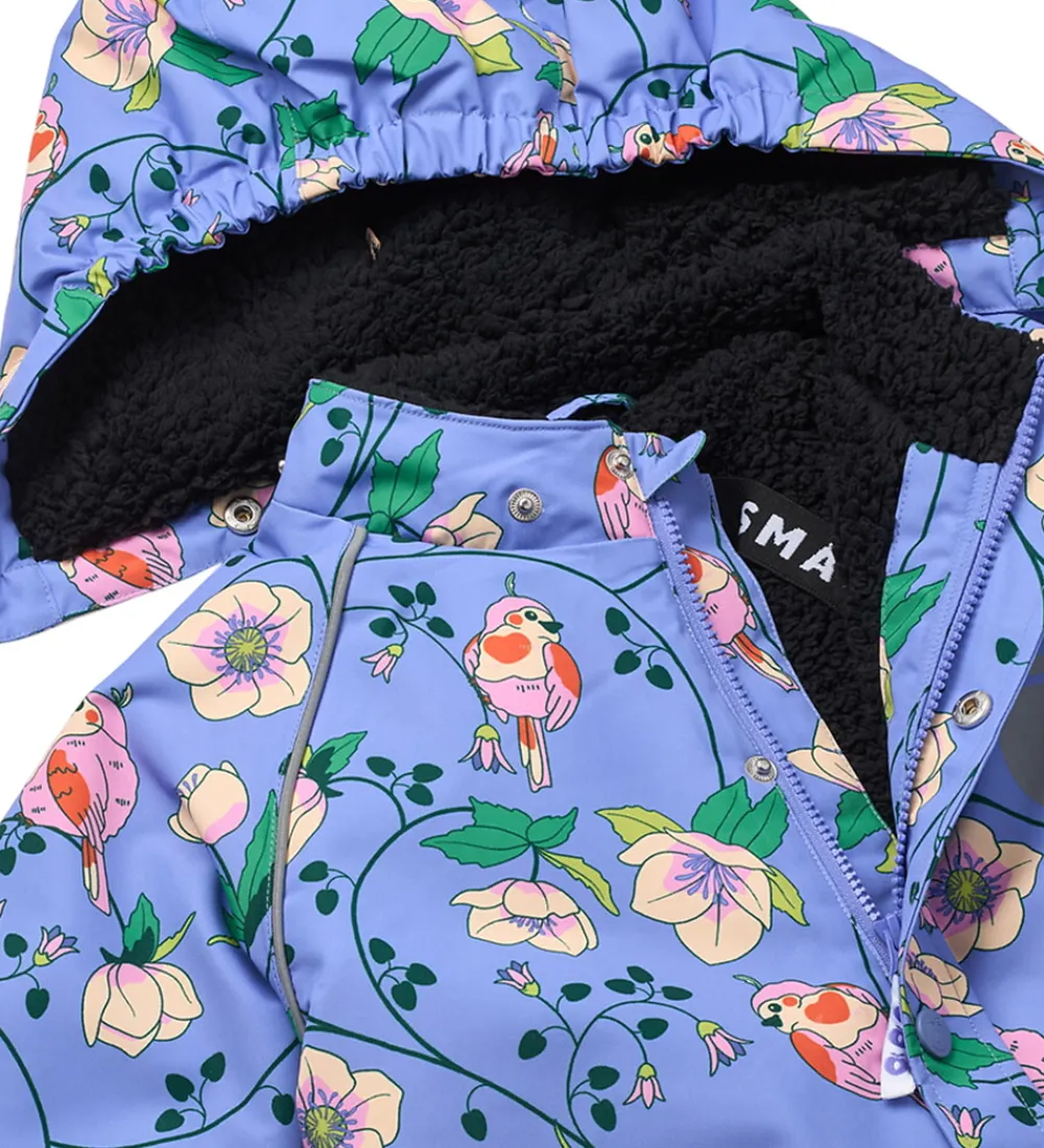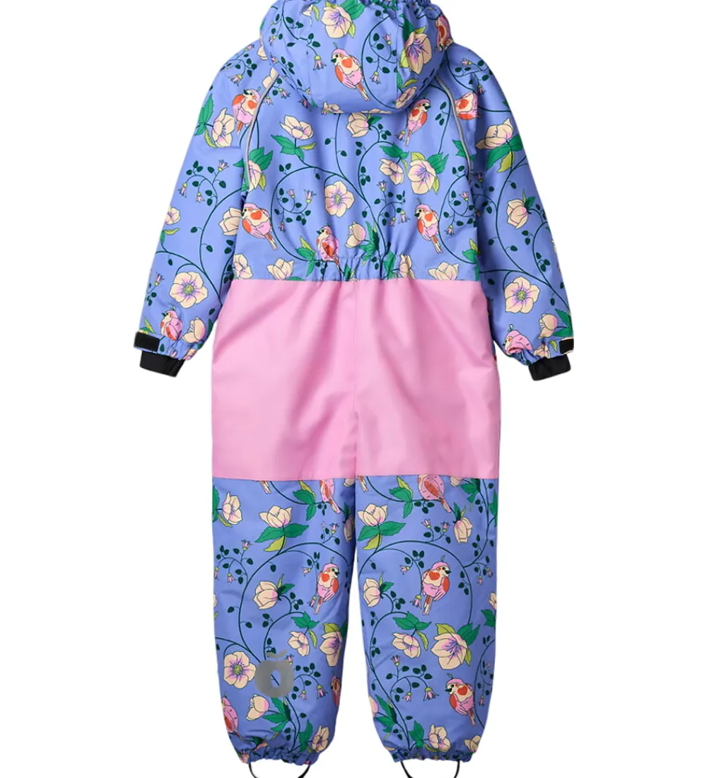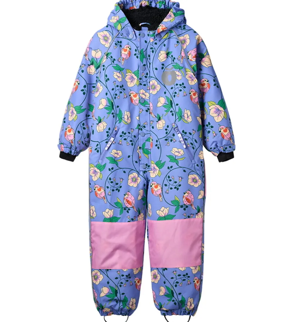 Skøn Småfolk flyverdragt i en smuk lilla nuance med et charmerende blomsterprint og farverige fugle. Flyverdragten har rosa forstrækninger og praktiske refleksdetaljer.