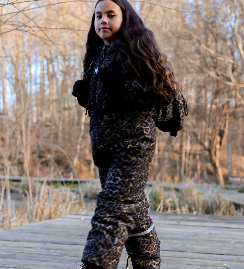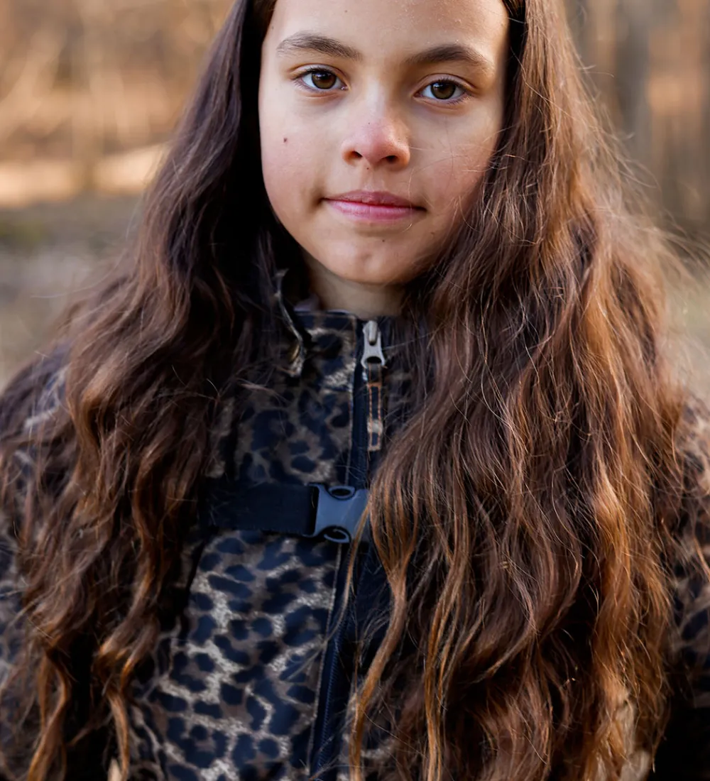 Flot Mikk-Line flyverdragt med et leopardprint i brune og sorte nuancer. Flyverdragten har refleksdetaljer på hætten, venstre ærme og højre ben.