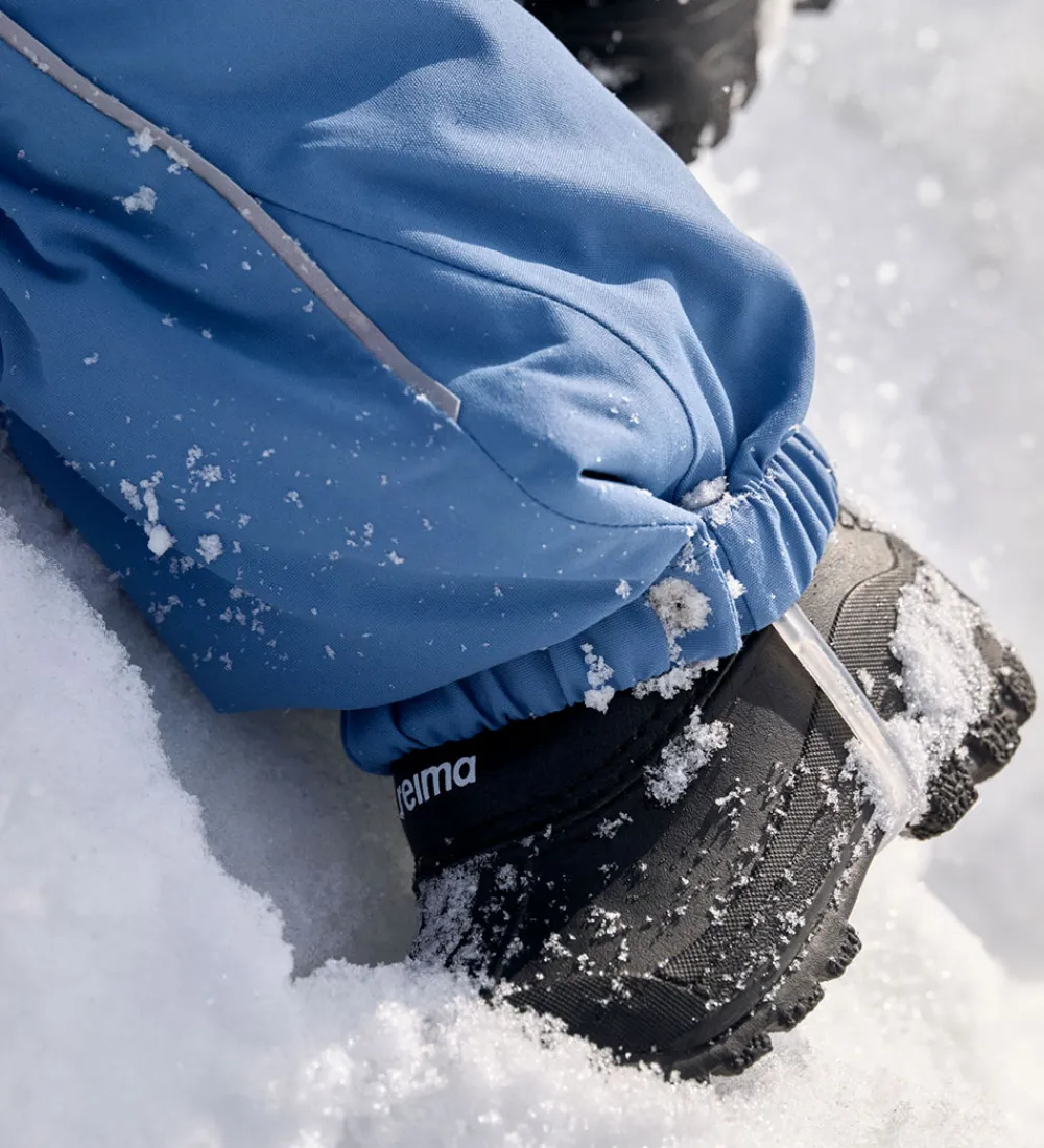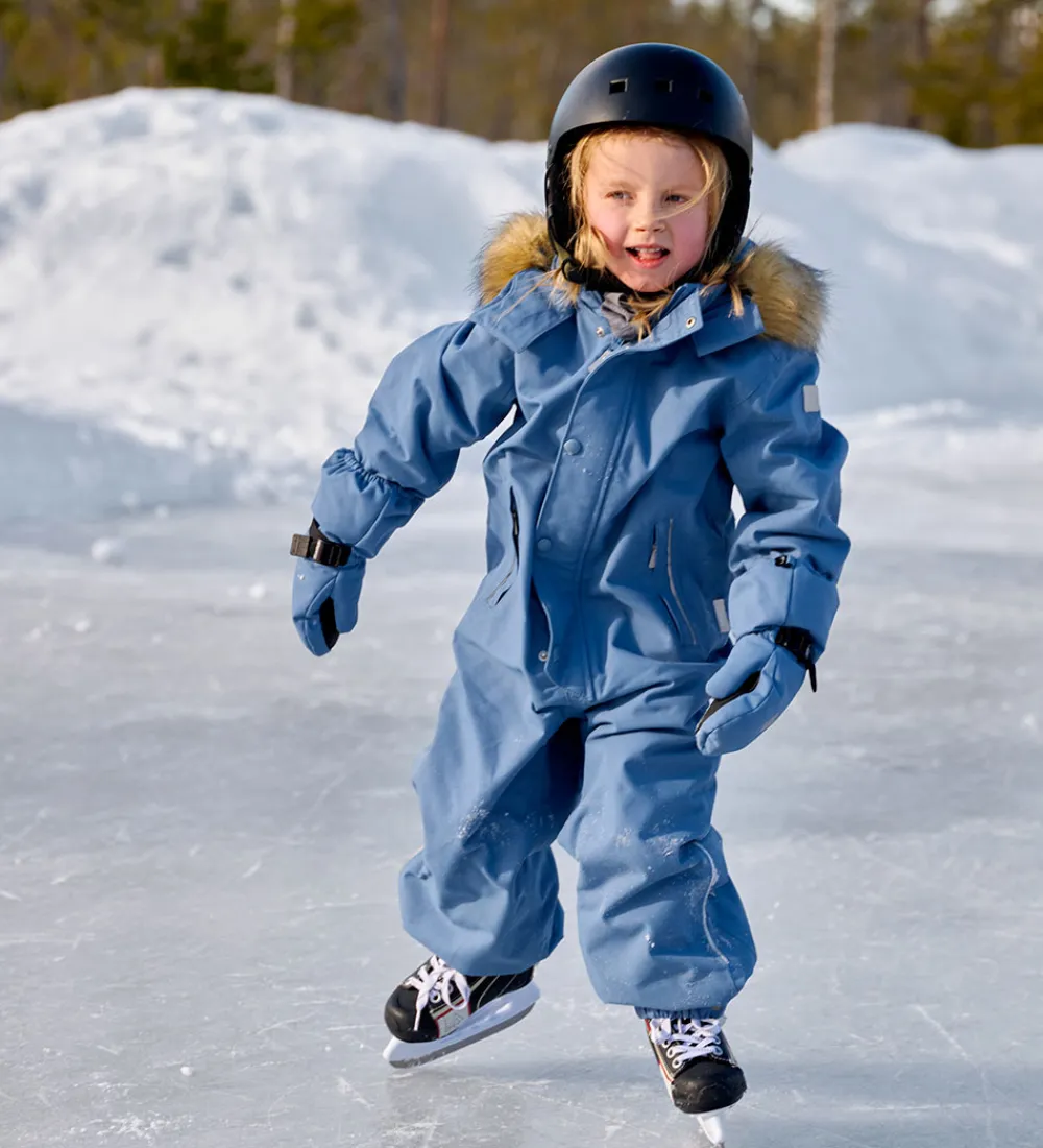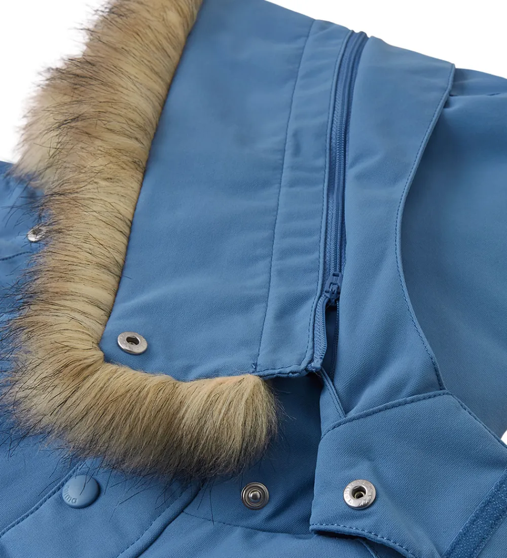 Sej Reima flyverdragt i ensartet, støvet blå, og hætten har en flot kant af imiteret pels.