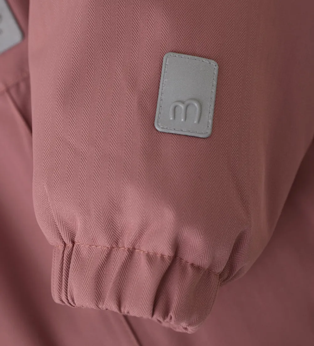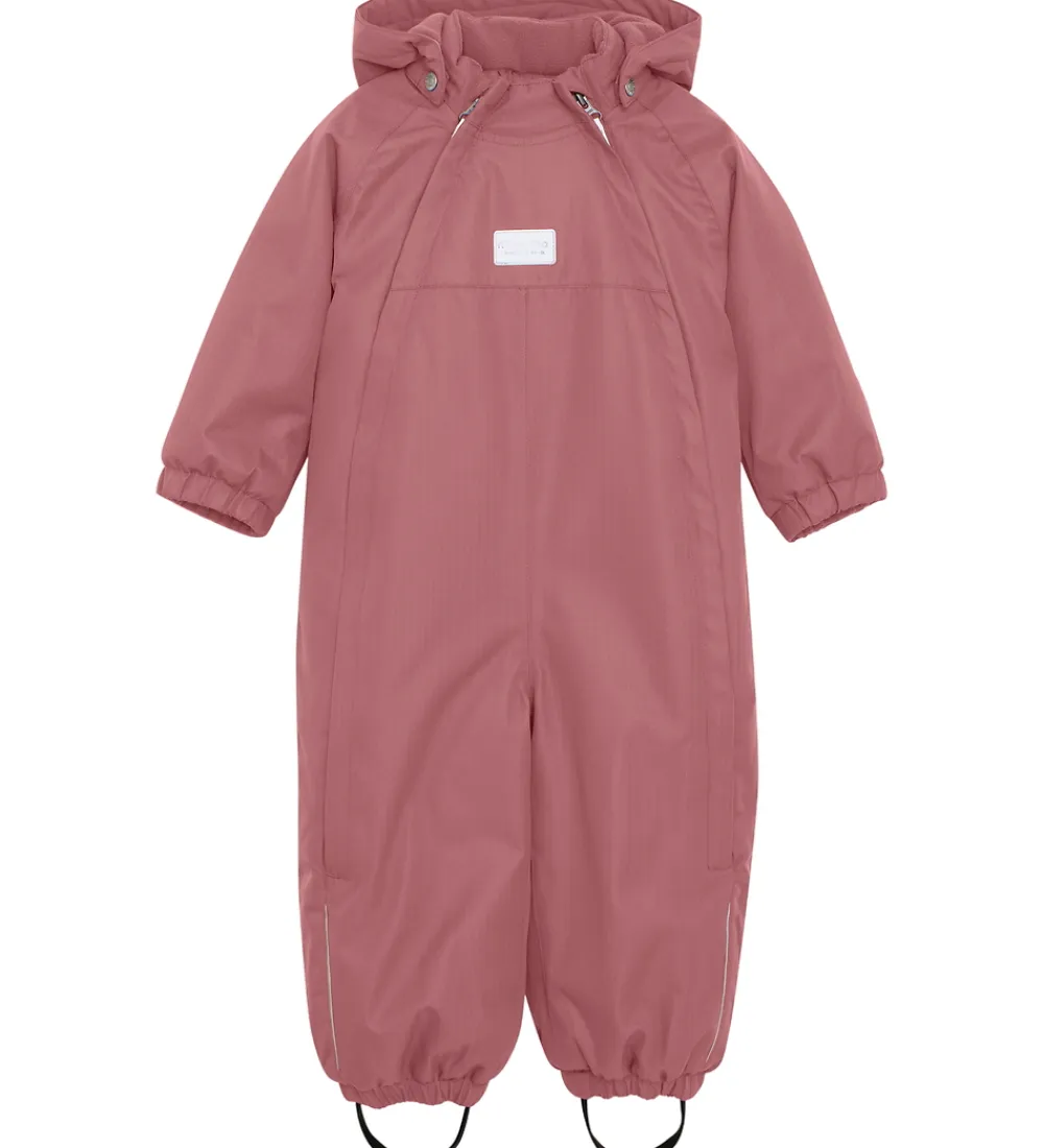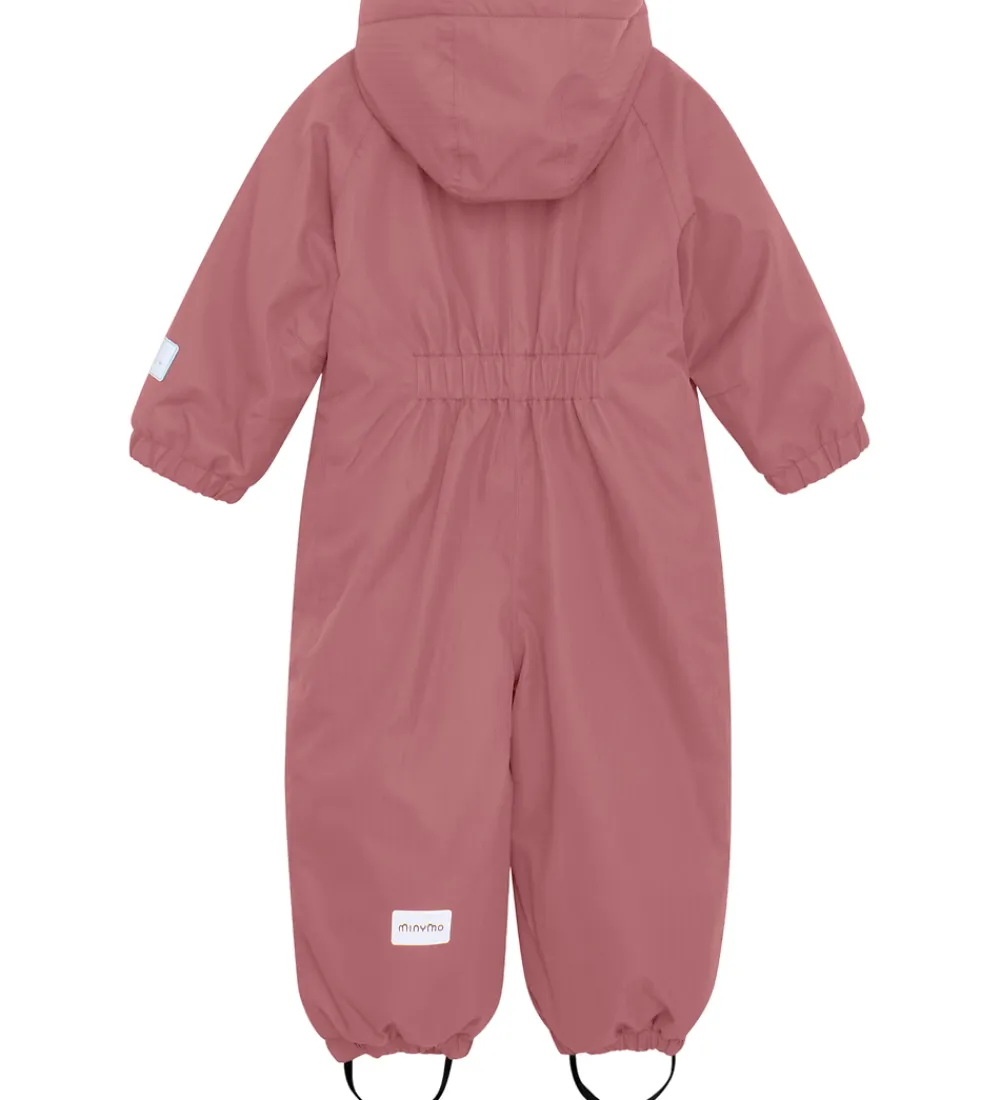 Dejlig Minymo flyverdragt i mørk rosa med flere velplacerede refleksapplikationer og -detaljer.